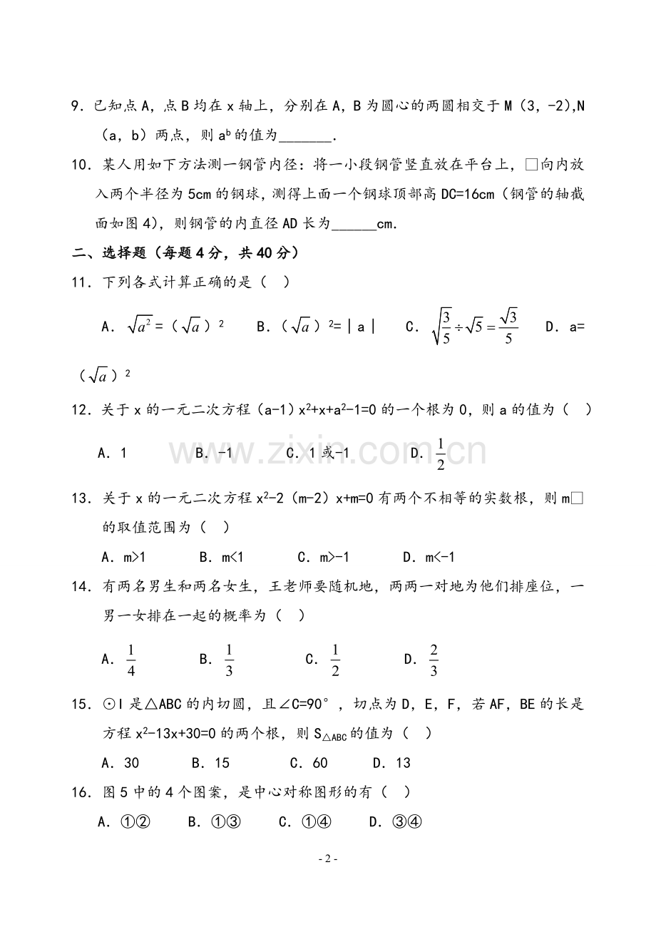 10.某人用如下方法测一钢管内径:将一小段钢管竖直放在平台上,向内放入两个半径为5cm的钢球,测得上面一个钢球顶部高DC=16cm(钢管的轴截面如图4),则钢管的内直径AD长为______cm.