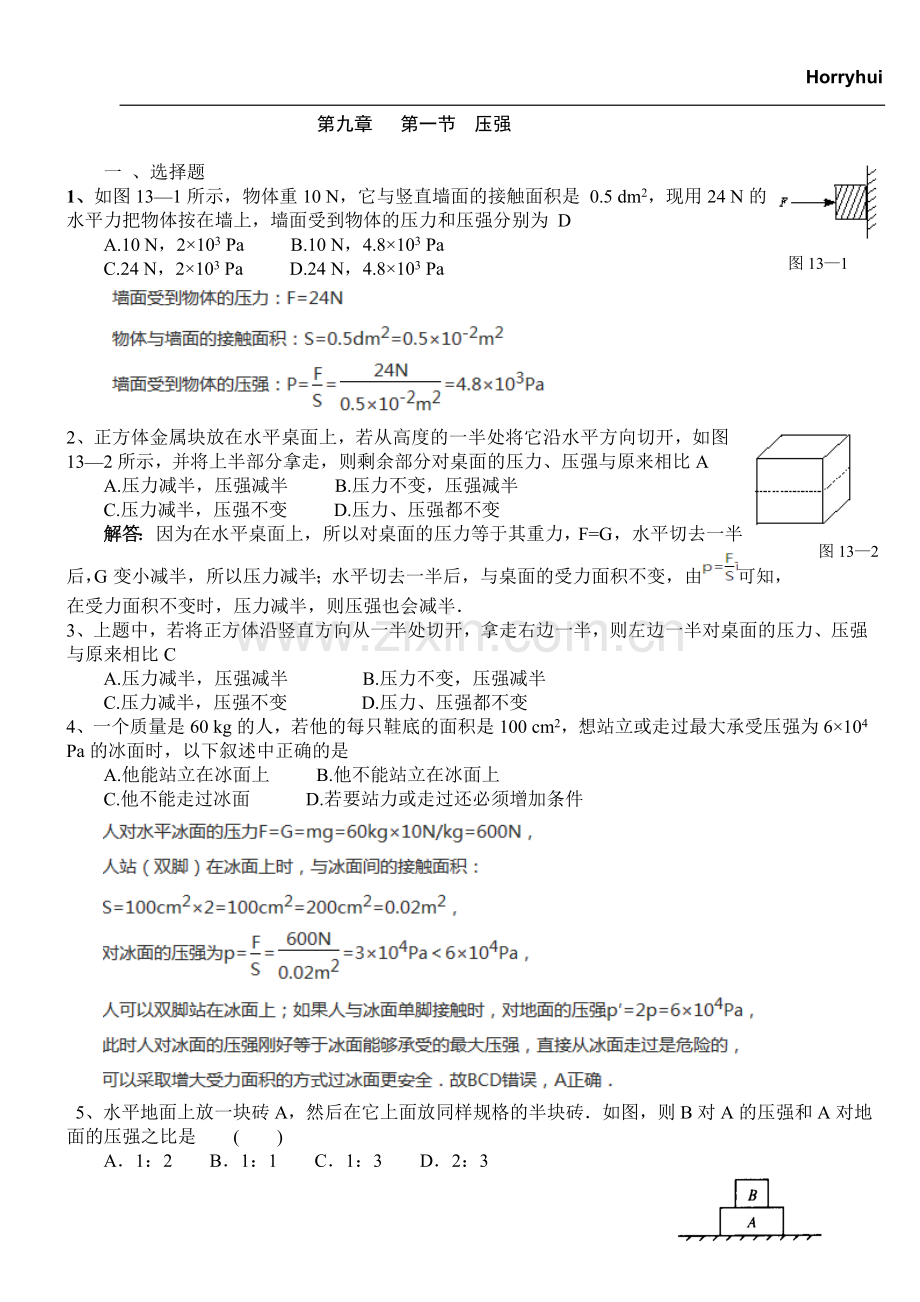 1、如图13—1所示,物体重10 N,它与竖直墙面的接触面积是 0.5 dm2,现用24 N的水平力把物体按在墙上,墙面受到物体的压力和压强分别为 D