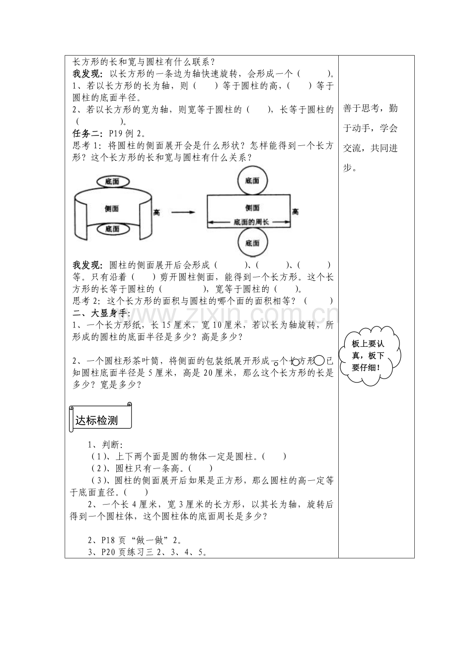 2、掌握圆柱侧面展开图与圆柱之间的关系,会根据它们之间的关系进行相关计算。