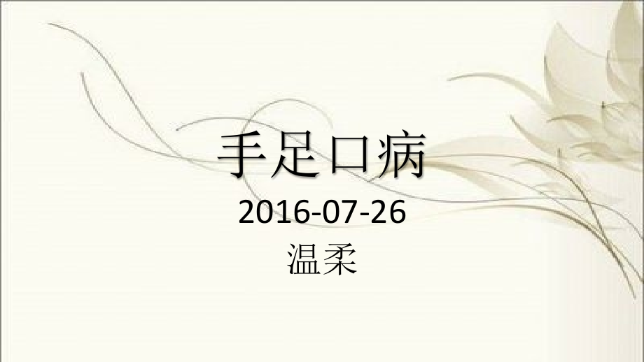 单击此处编辑母版标题样式,单击此处编辑母版文本样式,第二级,第三级,第四级,第五级,2016-7-26,#,手足口病,2016-07-26,温柔,病因,有数种病毒可引起手足口病,最常见的是,柯萨奇病毒A16型,,此外柯萨奇病毒 A的其他株或,肠道病毒71型,(,重症病例多由此感染引起,),也可引起手足口病,柯萨奇病毒是肠道病毒的一种,肠道病毒包括脊髓灰质炎病毒,柯萨奇病毒和埃可病毒,其感染部位是包括口腔在内的整个消化道,主要通过飞沫由呼吸道直接传染,亦可通过污染食物、衣服、用具等间接感染。,症状,斑丘疹(73%)低热(51%)恶心(43%)腹痛(63%)红晕(60%)拒食(43%),潜伏期35天,,有低热,全身不适,腹痛等前驱症,12天内口腔,咽,软腭,颊黏膜,舌,齿龈出现疼痛性粟粒至绿豆大小水疱,周围绕以红晕,破溃成小溃疡,由于疼痛,常流涎和拒食,同时手足亦出现皮疹,在手足的背侧面和手指(趾)背侧缘,甲周围,掌跖部,出现数目不定的水疱,除手足口外,亦可见于臀部及肛门附近,偶可见于躯干及四肢,数天后干涸,消退,皮疹无瘙痒,无疼痛感,一般经过良好,,全病程约510天,,多数可自愈,预后良好。,手足口病一年四季均可见到,以,夏秋季,较多,前驱症状:发疹前可有低热、头痛、食欲减退等。症状重者可以出现高热,体温3840。,手足损害:主要表现在手、足、指(趾)背或侧缘,尤其是指(趾)甲的周围及足跟的侧缘发生米粒至豌豆大小水疱,圆形或椭圆形,疱壁薄,内容澄清,呈乳白色。水疱偶发于掌跖及指的掌侧,其长轴与皮纹的走向一致,面部可有自发性疼痛或触痛。,口腔损害:硬腭、颊黏膜、舌、唇及齿龈等处发生粟粒大小水疱,疼痛,迅速破溃呈灰白色糜烂或浅溃疡,绕以红晕。,心脑损害:心肌炎、无菌性脑膜炎、脑炎。,周围血象淋巴细胞增多。血清学试验柯萨奇病毒抗体滴度升高。,病程约为1周,很少复发。,检查,1、实验室检查。,2、末梢血白细胞,一般病例白细胞总数和中性粒细胞数大多正常。重症病例白细胞计数可明显升高。,3、血生化检查,部分病例可有轻度ALT、AST、CK-MB升高,重症病例血糖可升高。,治疗,1.局部治疗,口腔用0.1%依沙吖啶或银花、甘草煎水含漱。病损处涂冰硼散、1%金霉素甘油等。,2.全身治疗,全身症状明显者给予广谱抗生素或磺胺类药。抗病毒可选用病毒灵0.1g,口服,每日3次。,3.中药治疗,药夏枯草、板蓝根或大青叶、连翘、贯众、金银花、甘草煎服,重症可使用干扰素。口腔溃疡用金霉素软膏或2%利多卡因或2%龙胆紫溶液外用。,护理诊断,1.,体温过高 与病毒感染有关,2.,皮肤完整性受损 与病毒引起的皮损有关,3.,潜在并发症,:,脑膜炎、肺水肿、呼吸衰竭、心力衰竭,护理措施,1、,消毒隔离,一旦发现感染了手足口病,宝宝应及时就医,避免与外界接触,一般需要隔离2周。宝宝用过的物品要彻底消毒:可用含氯的消毒液浸泡,不宜浸泡的物品可放在日光下曝晒。宝宝的房间要定期开窗通风,保持空气新鲜、流通,温度适宜。有条件的家庭每天可用乳酸熏蒸进行空气消毒。减少人员进出宝宝房间,禁止吸烟,防止空气污浊,避免继发感染。,护理措施,2、,饮食营养,如果在夏季得病,宝宝容易引起脱水和电解质紊乱,需要适当补水和营养。宝宝宜卧床休息1周,多喝温开水。患儿因发热、口腔疱疹,胃口较差,不愿进食。宜给宝宝吃清淡、温性、可口、易消化、柔软的流质或半流质,禁食冰冷、辛辣、咸等刺激性食物。,护理措施,3、,口腔护理,宝宝会因口腔疼痛而拒食、流涎、哭闹不眠等,要保持宝宝口腔清洁,饭前 饭后用生理盐水漱口,对不会漱口的宝宝,可以用棉棒蘸生理盐水轻轻地清洁口腔。可将维生素B 2 粉剂直接涂于口腔糜烂部位,或涂鱼肝油,亦可口服维生素B 2、维生素C,辅以超声雾化吸入,以减轻疼痛,促使糜烂早日愈合,预防细菌继发感染。,护理措施,4、,皮疹护理,宝宝衣服、被褥要清洁,衣着要舒适、柔软,经常更换。剪短宝宝的指甲,必要时包裹宝宝双手,防止抓破皮疹。臀部有皮疹的宝宝,应随时清理他的大小便,保持臀部清洁干燥。,手足部皮疹初期可涂炉甘石洗剂,待有疱疹形成或疱疹破溃时可涂0.5%碘伏。注意保持皮肤清洁,防止感染。小儿手足口病一般为低热或中度发热,无需特殊处理,可让宝宝多喝水。体温在37.538.5之间的宝宝,给予散热、多喝温水、洗温水浴等物理降温。,因为手足口病的感染主要是病毒的感染,针对病毒,目前来说我们还是以支持疗法为主,没有什么特别针对性的治疗,也提倡用病毒唑,但是总的来说效果都不是很理想。,因为抗病毒药一般在发病24小时到48小时前使用才是最佳的。而往往我们确诊手足口病的时候,都已经过了最有效的治疗阶段,现在也不提倡用这些抗病毒的药物。,预防控制措施,预防手足口病的,8,种消毒方法,盛放排泄物的容器:用每升500毫克有效氯含氯消毒剂作用120分钟。,患者衣、被单:煮沸20分钟或用每升500毫克有效氯含氯消毒剂作用30分钟。,蚊蝇:可用5%氯氰菊酯(奋斗呐)、2.5%溴氰菊酯或其他杀虫剂,按说明书使用。,饮用水:用每升1毫克3毫克有效氯含氯消毒剂,如漂白粉、优氯净等作用30分钟。,预防控制措施,生活用具、书籍、玩具、交通工具:用有效氯含氯消毒剂溶液擦拭消毒,作用时间30分钟,或用0.3%过氧乙酸作用60分钟,或用紫外线灯直接照射30分钟。,垃圾:用每升1000毫克有效氯含氯消毒剂溶液喷雾作用120分钟。,食具、饮具:用每升250毫克有