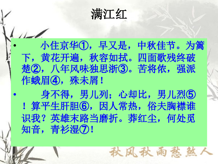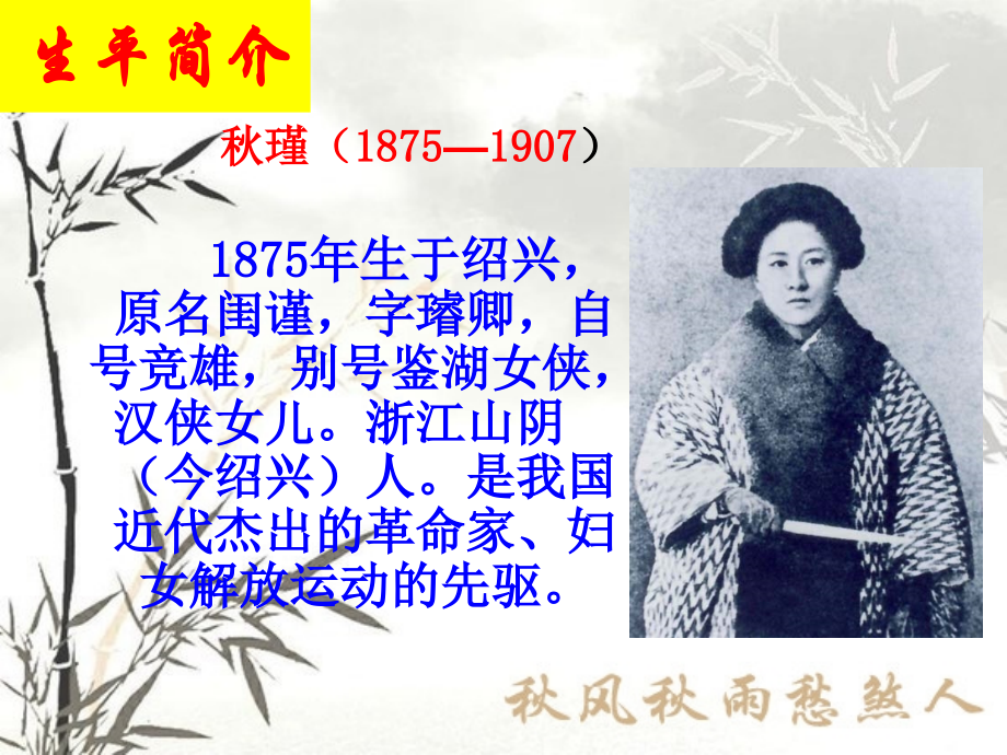 单击此处编辑母版标题样式,单击此处编辑母版文本样式,第二级,第三级,第四级,第五级,#,满江红,小住京华,早又是,中秋佳节。为篱下,黄花开遍,秋容如拭。四面歌残终破楚,八年风味独思浙。苦将侬,强派作蛾眉,殊未屑!,身不得,男儿列;心却比,男儿烈!算平生肝胆,因人常热,俗夫胸襟谁识我?英雄末路当磨折。莽红尘,何处觅知音,青衫湿!,生平简介,秋瑾(,1875,1907,),1875,年生于绍兴,原名闺谨,字璿卿,自号竞雄,别号鉴湖女侠,汉侠女儿。浙江山阴(今绍兴)人。是我国近代杰出的革命家、妇女解放运动的先驱。,历史上最拽的十个女子,长孙皇后(唐太宗),最贤惠的女人,上官婉儿,巾帼首相第一人,貂蝉,最早的女间谍,吕雉,最狠毒的女人,柳如是,最好命的红尘女子,李清照,最有才华的女人,夏姬(郑穆公之女),最妖娆的女人,文成公主,最成功女外交官,万贵妃(明宪宗妃子),最有魅力的女人,秋瑾,最豪气的女人,在国家民族面临危亡 的时候,巾帼不让须眉的一代女侠秋瑾,抛家弃子,女扮男装,东渡日本,去追求另样的生,去追求民族振兴的方法,把,“,最有豪气的女人,”,这样的称谓献给这样的女英雄的确是实至名归。,秋瑾的家庭,秋瑾是著名的近代民主革命志士。,1875,年生于绍兴的一个典型的小官僚地主家庭。其父秋寿南曾任湘乡县督销总办。秋瑾兄妹四人,秋瑾稍大即入家塾,受封建教育,念的是,三字经,、,百家姓,、,神童诗,等,但她爱读的却是诗词、明清小说和笔记传奇。,秋瑾又是中国近代文学史上杰出的女才子,其诗词既有女子的,“,柔婉细腻,”,又有男儿的,“,豪迈劲爽,”,刚柔相济,阴阳相和,体现了一种,“,中和之美,”,和独具魅力的,“,女性情怀,”,。,秋瑾的爱情与婚姻,1895,年,,19,岁的她跟随做官的父亲秋寿南来到湖南省湘潭县。秋寿南在当地结识了湘潭首富、曾国藩的表弟王殿丞。王见秋瑾生得秀美端庄,聪慧可爱,就托媒人送礼给儿子王廷钧提亲。,秋瑾对于这桩婚事十分不满,但在封建社会里,儿女的婚事只能依从父母之命,媒妁之言。,1896,年,4,月,20,日,王家彩銮花轿吹吹打打把秋瑾迎了过去。,王家虽锦衣玉食,但志趣高尚、性格刚烈的秋瑾并不喜欢过养尊处优的生活,更受不了封建家庭的种种束缚。比自己小两岁的丈夫王廷钧,在志趣、爱好上也与自己毫无共同之处。她叹息道:,“,琴瑟异趣,伉俪不甚相得。,”,王廷钧一不好读,二不务正业,每天游手好闲,吃喝玩乐,。,秋瑾的革命志向与理想,不仅得不到丈夫的理解与支持,反而遭到他的训斥:,“,这是男人的事情,你休胡思乱想。,”,秋瑾也不示弱:,“,我要去寻求真理,女人也有救国救民的责任。,”,两人吵得互不相让。,王廷钧知道秋瑾是个说得到做得到的倔强女性,要说服她是不可能的,只好采取卑劣手段,乘秋瑾不备,偷偷将她的珠宝和手饰及积蓄全部窃走,妄图以此来阻挠她赴日。秋瑾变卖了仅剩的财产和衣物,加上吴芝瑛等人的资助,于,1904,年,4,月只身东渡日本,从此迈出了她人生道路上的关键一步。,秋瑾在日本三年,两人从无书信来往,夫妻关系名存实亡。,1906,年冬秋瑾听说王廷钧纳妾的消息,反而高兴,觉得有了与王廷钧脱离关系的理由。于是,她给大哥秋誉章写了一封信,请大哥代她办理离婚。秋誉章几经奔波,由于王廷钧的阻碍,离婚之事未成。,秋瑾的创作,秋瑾短促的一生创作了很多诗词。现在,秋瑾集,收存诗、词、歌二百二十多首,另有集外佚诗约十五首,攻二百四十余首。如以,1904,年东渡日本为界,其诗作可分为前后期。,前期:,1891-1904,后期:,1904-1907,前期主要是咏物写景、感事抒怀、思念亲友之作。,后期主要是抒发立志改天换地的革命豪情,充满了对祖国前途的深切忧虑。,满江红,小住京华,早又是,中秋佳节。为篱下,黄花开遍,秋容如拭。四面歌残终破楚,八年风味独思浙。苦将侬,强派作蛾眉,殊未屑!,身不得,男儿列;心却比,男儿烈!算平生肝胆,因人常热,俗夫胸襟谁识我?英雄末路当磨折。莽红尘,何处觅知音,青衫湿!,写作背景,1903,年春,王廷均用钱捐得户部主事官职,秋瑾随夫入京。,时值八国联军入侵后不久,她目睹民族危机的深重和清政府的腐败,决心献身救国事业,而其夫无心国事。中秋节,秋瑾与丈夫王廷均发生冲突,离家出走,寓居北京阜城门外泰顺客栈,后由吴芝瑛出面调解,而秋瑾下决心冲破家庭牢笼,投身革命。不久即东渡日本留学。,这首词是她在中秋节的述怀之作,反映了她在封建婚姻家庭和旧礼教的束缚中,走向革命道路前夕的苦闷彷徨和雄心壮志的开阔胸怀,【,注释,】,京华:京城之美称。因京城是文物、人才汇集之地,故称为京华。,四面歌残终破楚:此处用,史记,项羽本纪,中汉军破楚的故事,来比喻说明自己终于冲破家庭牢笼。,八年风味独思浙:应为“独思浙八年风味”的倒装。指作者在浙江时过的貌似贵妇的生活,实则处于被奴役的地位。,娥眉:漂亮的女人,美女。指作者当时的贵妇人身份。,烈:刚烈。,肝胆:指真诚的心。,青衫湿:唐白居易,琵琶行,中有“江州司马青衫湿”句,指眼泪打湿了衣服。,【,翻译,】,我在京城小住时日,转眼间就又到了中秋佳节。篱笆下面的菊花都已盛开,秋色明净,就像刚刚擦洗过一般。四面的歌声渐歇,我也终如汉之破楚,突破了家庭的牢笼,如今一个人思量着在浙江时那八年的生活况味。他们苦苦地想让我做一个贵妇人,其实,我是多么的不屑啊!,今生我虽