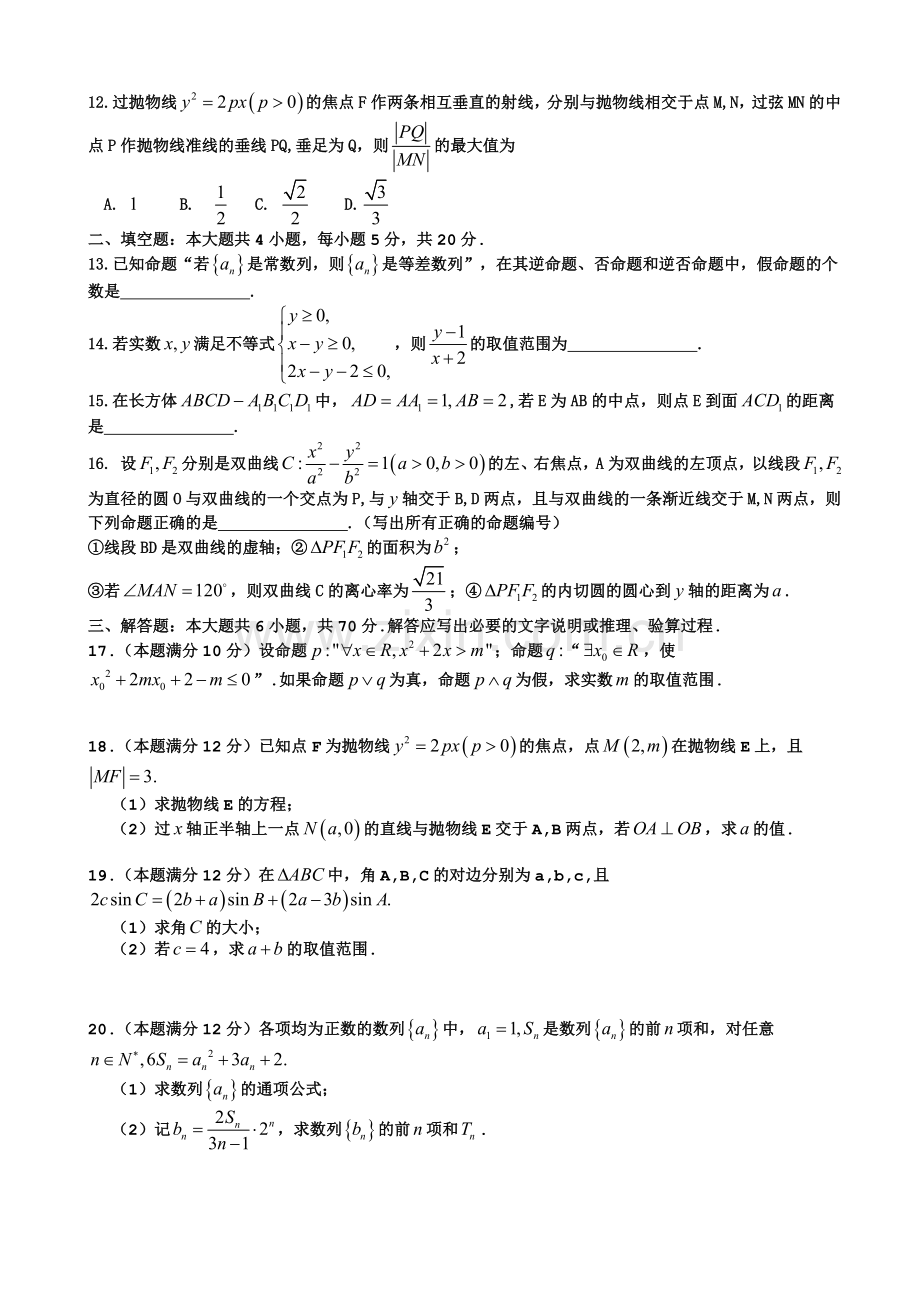 18.(本题满分12分)已知点F为抛物线的焦点,点在抛物线E上,且