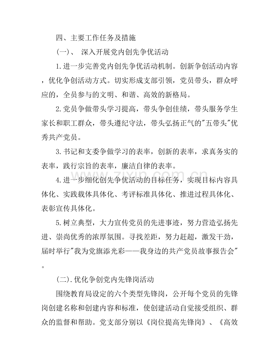 以XX党委工作纲要为指导,继续贯彻党委全年八项工作任务,结合学校教育教学工作实际,深入开展党内创先争优、基层组织建设年、学习型党组织、五型班子创建、党风廉政建设、服务民生等工作,充分发挥支部战斗堡垒和党员模范作用,发挥共、青、妇组织优势,关心职工、促进和谐,为保证各项工作任务优质完成,提供有力的思想支撑和组织保障,以优异成绩向党的十八大献礼。