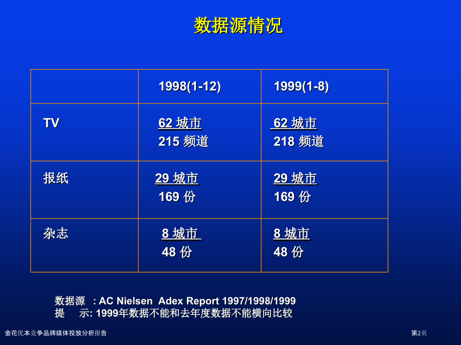 Click to edit Master title style,Click to edit Master text styles,Second level,Third level,Fourth level,Fifth level,*,*,Click to edit Master title style,Click to edit Master text styles,Second level,Third level,Fourth level,Fifth level,Click to edit Master title style,Click to edit Master text styles,Second level,Third level,Fourth level,Fifth level,“金花优本”,竞争品牌媒体投放分析,98年1月-99年8月,金花优本竞争品牌媒体投放分析报告,第1页,数据源:AC Nielsen Adex Report 1997/1998/1999,提 示:1999年数据不能和去年度数据不能横向比较,数据源情况,1998(1-12)1999(1-8),TV,62 城市,62 城市,215 频道 218 频道,报纸,29 城市,29 城市,169 份 169 份,杂志,8 城市,8 城市,48 份 48 份,金花优本竞争品牌媒体投放分析报告,第2页,统计方法解释,费用方面,竞争对手费用投放监测以媒体刊例价为基础,购置之中产生折扣未计算,监测投放金额大于实际投放金额,时段赠予,监测到全部时段均认为是按刊例购置监测投放金额大于实际投放金额,金花优本竞争品牌媒体投放分析报告,第3页,每年媒体费用增加率,电视:10%,平面:10%,造成监测到投放费用增加,杂志方面,尽管到1999年我们已经监测到国内/国际时尚和生活杂志已经到了48种,但仍不能覆盖全部杂志。,所以只能监测到国际品牌投放情况,统计方法解释,金花优本竞争品牌媒体投放分析报告,第4页,昂立系列产品媒体投放分析,金花优本竞争品牌媒体投放分析报告,第5页,昂立全部产品投放费用,RMB000,+194%,全部:119,279,全部:181,071,金花优本竞争品牌媒体投放分析报告,第6页,昂立全部产品投放费用百分比(1998.1-12),1998 1月-12月,总投放:RMB119,279,000,金花优本竞争品牌媒体投放分析报告,第7页,昂立全部产品投放费用百分比(1998.1-8),1998 1月-8月,总投放:RMB61,678,000,金花优本竞争品牌媒体投放分析报告,第8页,昂立全部产品投放费用百分比(1999.1-8),1998 1月-8月,总投放:RMB181,071,000,金花优本竞争品牌媒体投放分析报告,第9页,RMB000,+122%,+233%,+423%,+238%,昂立全部产品投放区域性分析,金花优本竞争品牌媒体投放分析报告,第10页,昂立全部产品媒介使用百分比,1998(1月-12月),1998(1月-8月),1999(1月-8月),金花优本竞争品牌媒体投放分析报告,第11页,RMB000,+5%,+240%,+230%,+418%,昂立一号投放区域性分析,金花优本竞争品牌媒体投放分析报告,第12页,昂立一号:媒体使用百分比,1998(1月-12月),1998(1月-8月),1999(1月-8月),金花优本竞争品牌媒体投放分析报告,第13页,昂立全部产品季节性投放规律1998 1月 1999 8月,RMB000,金花优本竞争品牌媒体投放分析报告,第14页,盘龙排毒养颜胶囊投放分析,金花优本竞争品牌媒体投放分析报告,第15页,盘龙全部产品投放费用,RMB000,+86%,总费用:55,139,总费用:56,938,金花优本竞争品牌媒体投放分析报告,第16页,RMB000,+18%,+66%,+42%,+99%,+,盘龙全部产品投放区域性分析,金花优本竞争品牌媒体投放分析报告,第17页,盘龙全部产品媒体使用分析,1998(1月12月),1998(1月8月),1999(1月8月),金花优本竞争品牌媒体投放分析报告,第18页,盘龙全部产品季节性投放分析1998 1月-1999 8月,RMB000,金花优本竞争品牌媒体投放分析报告,第19页,养生堂系列产品投放分析,金花优本竞争品牌媒体投放分析报告,第20页,养生堂全部产品投放费用,RMB000,+30%,总费用:208,664,总费用:167,588,金花优本竞争品牌媒体投放分析报告,第21页,养生堂全部产品投放百分比(1998 1月-12月),1998 1月-12月,总投放:RMB208,664,000,金花优本竞争品牌媒体投放分析报告,第22页,养生堂全部产品投放百分比(1998 1月-8月),1998 1月-8月,总投放:RMB129,001,000,金花优本竞争品牌媒体投放分析报告,第23页,养生堂全部产品投放百分比分析(1999 1月-8月),1998 Jan-Dec,Total Spending:RMB167,588,000,金花优本竞争品牌媒体投放分析报告,第24页,RMB000,+5%,+70%,+57%,+34%,养生堂全部产品投放区域性分析,金花优本竞争品牌媒体投放分析报告,第25页,养生堂全部产品媒体使用百分比,1998(1月-12月),1998(1月-8月),1999(1月-8月),金花优本竞争品牌媒体投放分析报告,第26页,养生堂全部产品投放季节性分析1998 1月-1999 8月,RMB000,金花优本竞争品牌媒体投放分析报告,第27页,恒寿堂系列产品媒体投放分析,金花优本竞争品牌媒体投放分析报告,第28页,恒寿堂全部产品投放费用,RMB000,+,总费用:7,236,总费用:25,087,金花优本竞争品牌媒体投放分析报告,第29页,恒寿堂全部产品投放费用百分比(1998 1月-12月),1998 1月-12月,总投放:RMB7,236,000,金花优本竞争品牌媒体投放分析报告,第30页,恒寿堂全部产品投放百分比(1999 1月-8月),1998 1月-8月,总投放:RMB25,087,000,金花优本竞争品牌媒体投放分析报告,第31页,恒寿堂全部产品主要市场分布,RMB000,+,+,金花优本竞争品牌媒体投放分析报告,第32页,恒寿堂全部产品2级主要市场分布,RMB000,+,+,+,+,金花优本竞争品牌媒体投放分析报告,第33页,恒寿堂全部产品媒体使用百分比,1998(1月-12月),1998(1月-8月),1999(1月-8月),没有投放,金花优本竞争品牌媒体投放分析报告,第34页,恒寿堂全部产品季节性投放规律1998 1月-1999 8月,RMB000,金花优本竞争品牌媒体投放分析报告,第35页,