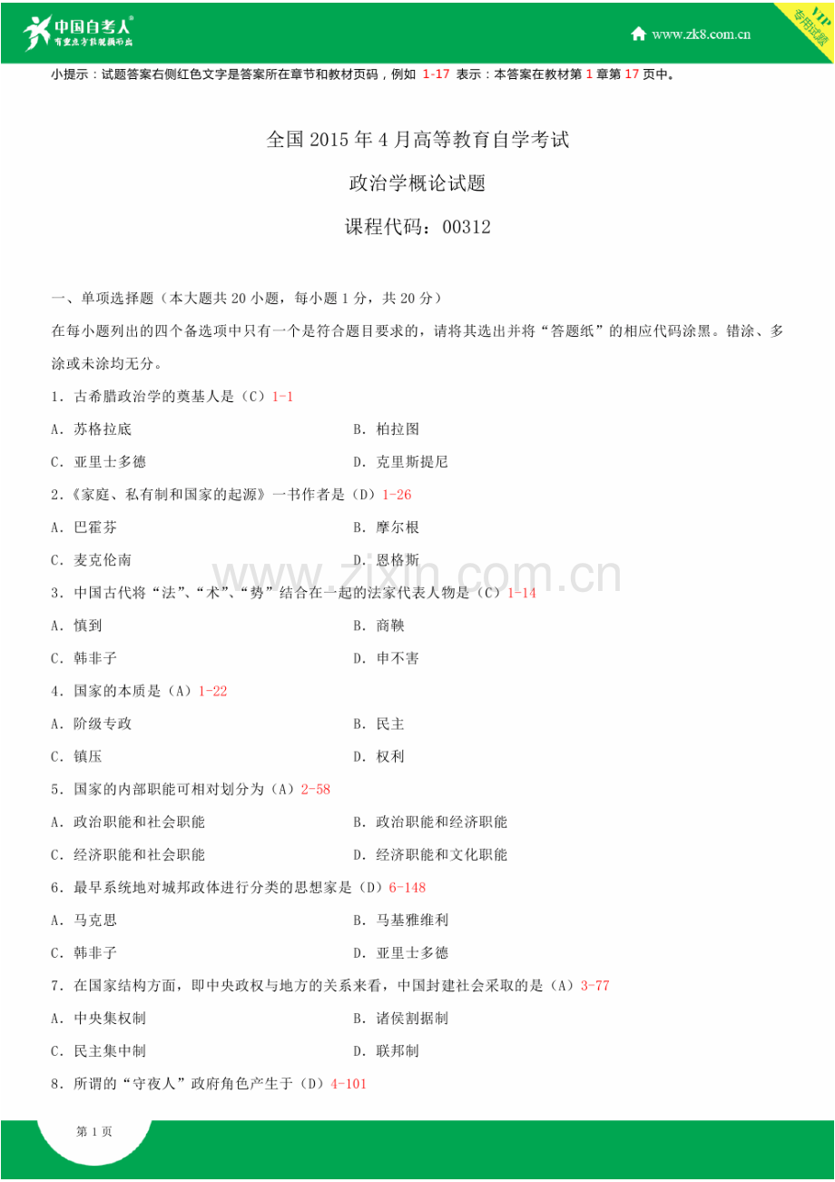 全国2015年4月自学考试00312政治学概论试题答案.doc_第1页