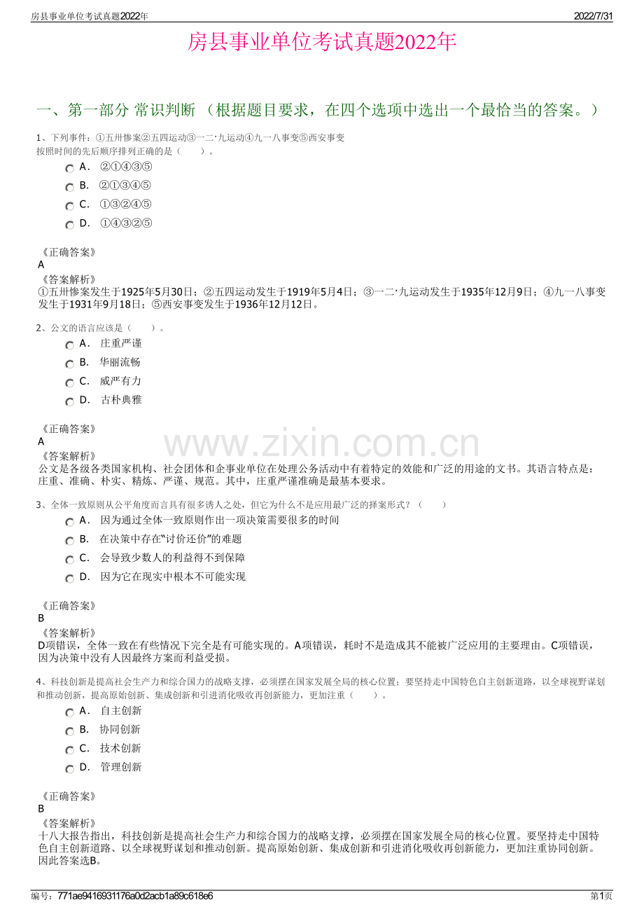 房县事业单位考试真题2022年一、第一部分 常识判断 (根据题目要求,在四个选项中选出一个最恰当的答案。)1、下列事件:五卅惨案五四运动一二九运动九一八事变西安事变按照时间的先后顺序排列正确的是()。 A B C D 正确答案A答案解析五卅惨案发生于1925年5月30日;五四运动发生于1919年5月4日;一二九运动发生于1935年12月9日;九一八事变发生于1931年9月18日;西安事变发生于1936年12月12日。2、公文的语言应该是()。 A 庄重严谨 B 华丽流畅 C 威严有力 D 古朴典雅正确答案A答案解析公文是各级各类国家机构、社会团体和企事业单位在处理公务活动中有着特定的效能和广泛的用途的文书。其语言特点是:庄重、准确、朴实、精炼、严谨、规范。其中,庄重严谨准确是最基本要求。3、全体一致原则从公平角度而言具有很多诱人之处,但它为什么不是应用最广泛的择案形式?() A 因为通过全体一致原则作出一项决策需要很多的时间 B 在决策中存在“讨价还价”的难题 C 会导致少数人的利益得不到保障 D 因为它在现实中根本不可能实现正确答案B答案解析D项错误,全体一致在有些情况下完全是有可能实现的。A项错误,耗时不是造成其不能被广泛应用的主要理由。C项错误,因为决策中没有人因最终方案而利益受损。4、科技创新是提高社会生产力和综合国力的战略支撑,必须摆在国家发展全局的核心位置;要坚持走中国特色自主创新道路,以全球视野谋划和推动创新,提高原始创新、集成创新和引进消化吸收再创新能力,更加注重()。 A 自主创新 B 协同创新 C 技术创新 D 管理创新正确答案B答案解析十八大报告指出,科技创新是提高社会生产力和综合国力的战略支撑,必须摆在国家发展全局的核心位置。要坚持走中国特色自主创新道路、以全球视野谋划和推动创新。提高原始创新、集成创新和引进消化吸收再创新能力,更加注重协同创新。因此答案选B。房县事业单位考试真题2022年2022/7/31编号:771ae9416931176a0d2acb1a89c618e6第1页5、关于地球生物演化史,下列哪组排序是正确的?() A 蓝藻蕨类裸子植物被子植物 B 节肢动物草履虫软体动物脊椎动物 C 细菌腔肠动物爬行类鱼类 D 苔藓绿藻菌类双子叶植物正确答案A答案解析B项错误,草履虫是单细胞动物,最早出现,软体动物在节肢动物之前单细胞动物之后。C项错误,鱼类的出现早于爬行类动物。D项错误,苔藓属于蕨类植物,应晚于绿藻、菌类。6、对偷盗婴儿的行为以绑架罪论处的,必须是行为人()。 A 导致婴儿死亡的 B 出于出卖目的 C 以勒索财物为目的 D 已完成该犯罪行为正确答案C答案解析中华人民共和国刑法第二百三十九条规定,以勒索财物为目的偷盗婴幼儿的以绑架罪论处。因此答案选C。7、在2013年中央政府工作报告会上,温家宝指出,过去五年,我国国内生产总值从26.6万亿元增加到51.9万亿元,跃升到世界第_位,国内生产总值增长_。() A 一;7.8% B 二;7.8% C 一;7.5% D 二;7.5%正确答案B答案解析B项,2013年3月5日,第十二届全国人民代表大会在北京召开,温家宝同志在做2013年中央政府工作报告时指出:“过去五年,我国国内生产总值从26.6万亿元增加到51.9万亿元,跃升到世界第二位。国内生产总值增长7.8%,城镇新增就业1266万人。居民消费价格涨幅回落到2.6%。”8、“无山不洞,无洞不奇,无村不榕,无榕不荫。有水皆成瀑,城有石头城。左手拎芭蕉,右肩挎黄橙。相逢毋须问,十九布依人。”以上文字描绘的景观最可能出现在下列哪个地区?() A 东北平原 B 四川盆地 C 云贵高原 D 长江三角洲正确答案C答案解析贵州地形崎岖不平,喀斯特地形分布广泛,“无山不洞,无洞不奇,无村不榕,无榕不荫。有水皆成瀑,城为石头砌。左手拎芭蕉,右肩挎黄橙。相逢毋须问,十九布依人”这种现象多见于贵州省。因此C项正确。9、先秦两汉时期成就最高、影响最大、通过人物描写来反映历史面貌的作品是()。 A 左传 B 史记 C 国语 D 战国策房县事业单位考试真题2022年2022/7/31编号:771ae9416931176a0d2acb1a89c618e6第2页正确答案B答案解析ACD三项错误,左传是一部编年体史书,国语是中国最早的一部国别史著作,战国策是一部国别体史书。B项正确,史记是历史上第一本“纪传体”史书,不同于前代史书所采用的以时间为次序的编年体,或以地域为划分的国别体,而是以人物传记为中心来反映历史内容的一种体例,集中反映了我国汉以前三千年间政治、经济、文化各方面的发展过程。10、维生素是动物体不可缺少的有机成分,如果缺少了就会引起各种疾病。下列维生素缺乏症与缺乏元素对应不正确的是()。 A 夜盲症维生素A B 坏血病维生素C C 佝偻症维生素D D 脂溢性皮炎维生素B1正确答案D答案解析维生素B1主要参与糖代谢和刺激胃肠蠕动,缺乏时会出现肢体麻木、水肿,记忆力受损,常伴有消化不良,食欲缺乏等症状。维生素B2(核黄素)能够促进发育和细胞的再生,促使皮肤、指甲、毛发的正常生长,帮助消除口腔内、唇、舌的炎症,增进视力,减轻眼睛的疲劳,因此被广泛使用到脂溢性皮炎的治疗中。11、下列关于行政决策的表述,不正确的是()。 A 决策过程中最核心、最关键的一步是评估方案,作出决策 B 提高行政效率是行政决策科学化的重要前提 C 行政决策是履行行政管理职能的中心环节 D 在程序化决策和非程序化决策之间,领导者往往更应集中精力作好非程序化决策正确答案B答