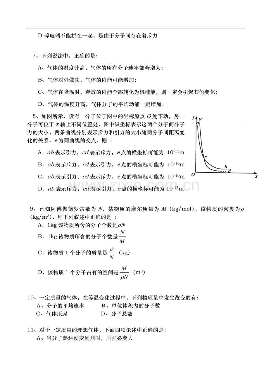 9、已知阿佛伽德罗常数为N,某物质的摩尔质量为M(kg/mol),该物质的密度为ρ(kg/m3),则下列叙述中正确的是 :