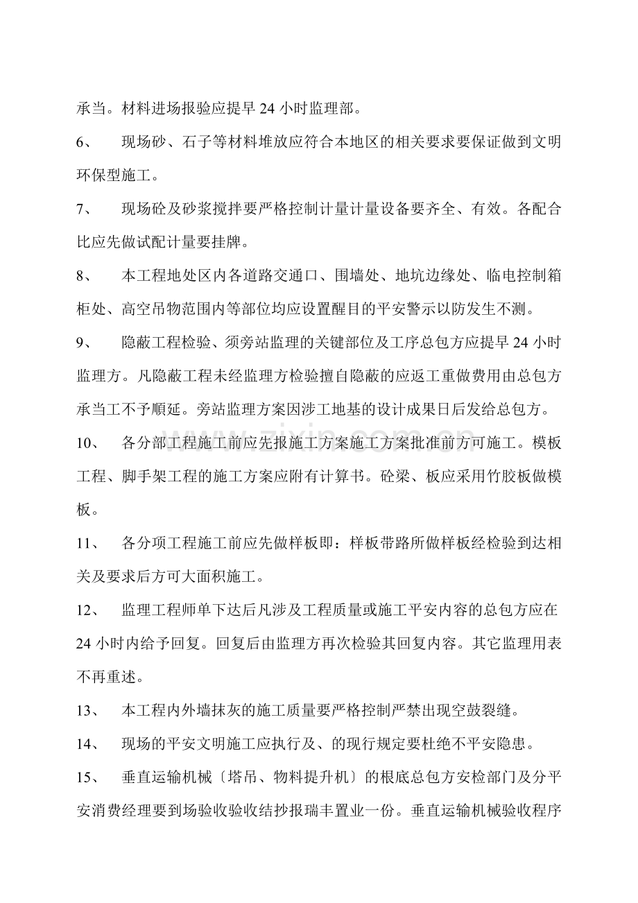 9、 隐蔽工程检验、须旁站监理的关键部位及工序总包方应提早24小时监理方。凡隐蔽工程未经监理方检验擅自隐蔽的应返工重做费用由总包方承当工不予順延。旁站监理方案因涉工地基的设计成果日后发给总包方。
