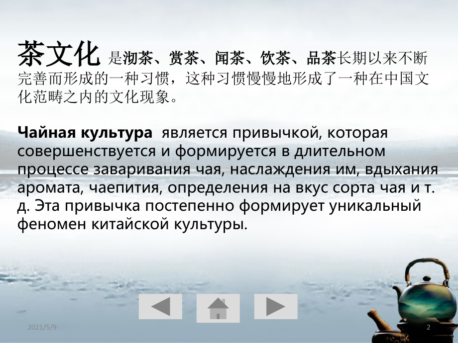 单击此处编辑母版标题样式,单击此处编辑母版文本样式,第二级,第三级,第四级,第五级,2021/5/9,*,单击此处编辑母版标题样式,单击此处编辑母版文本样式,第二级,第三级,第四级,第五级,2021/5/9,*,茶,2021/5/9,1,茶文化,是,沏茶、赏茶、闻茶、饮茶、品茶,长期以来不断完善而形成的一种习惯,这种习惯慢慢地形成了一种在中国文化范畴之内的文化现象。,.,2021/5/9,2,2021/5/9,3,中国谚语,(,),开门七件事:,(,),柴、米、油、盐、酱、醋、,中国是茶的故乡,是茶文化的发源地,饮茶是中国人生活中的重要内容,。,茶,2021/5/9,4,2021/5/9,5,中国是茶树的原产地之一。中国最早发现并利用茶这种植物,把它发展形成为一种灿烂独特的文化,并且逐步地传播到中国的周边国家乃至整个世界,这是中国在茶业上对全世界做出了贡献。,.,.,.,2021/5/9,6,茶叶品种,名茶荟萃,茶叶百科,2021/5/9,7,茶叶品种,中国是世界上唯一拥有六大基本茶类的国家。,.,六大茶类分别是,绿茶,黑茶,白茶,黄茶,红茶,青,茶,2021/5/9,8,绿茶,西湖龙井,、,洞庭碧螺春,、,庐山云雾,、,信阳毛尖,2021/5/9,9,黄茶,君山银针,蒙顶黄芽,鹿苑毛尖,2021/5/9,10,黑茶,“,三尖,”,天尖、贡尖、生尖,2021/5/9,11,白茶,白毫银针,2021/5/9,12,红茶,-,祁门红茶,2021/5/9,13,青茶,又名乌龙茶,-,铁观音,2021/5/9,14,名茶荟萃,西湖龙井,祁门红茶,(),白毫银叶,武夷岩茶,安溪铁观音,洞庭碧螺春,黄山毛峰,庐山云雾,六安瓜片,云南普洱茶,(),2021/5/9,15,茶道,是以修行,悟道为,宗旨的饮茶艺术,,是饮茶之道和饮茶修道的统一。,茶,道,2021/5/9,16,中国茶道的具体表现形式有三种:,.,2021/5/9,17,煎茶,煎茶:把茶末投入壶中和水一起,煎煮。唐代的煎茶,是茶,的最早艺术品尝形式。,:,.,.,2021/5/9,18,.,.,.,.,斗茶,:,2021/5/9,19,功夫茶,2021/5/9,20,2021/5/9,21,2021/5/9,22,2021/5/9,23,喝茶的好处,.,2021/5/9,24,茶叶中含有宝贵的微量元素,几乎其他的食物,所没,有,的,:,铜,氟,铁,锰,锌,钙。,:,.,2021/5/9,25,电脑族每天应喝,4,杯茶,长时间面对电脑不利于眼睛的健康。,每天喝,“,四杯茶,”,,不仅可以减少辐射的侵害,还有益于保护眼睛。,4 ,.,“”,.,2021/5/9,26,谢 谢,!,2021/5/9,27,