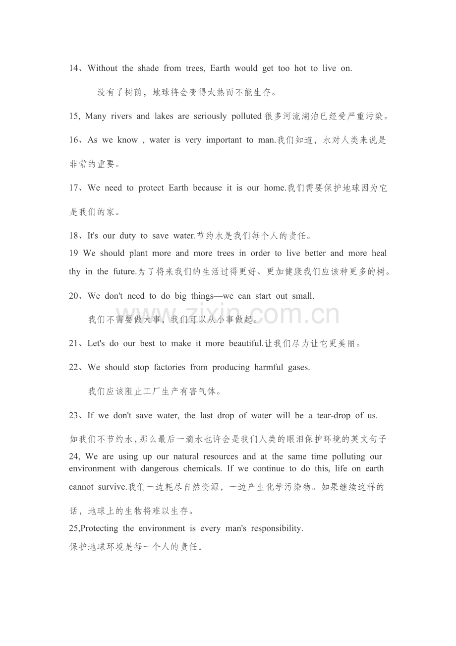 26、 if everyone could make a big contribution to environmental protection, our home will become much more beautiful.如果每个人为环境保护作出一点贡献