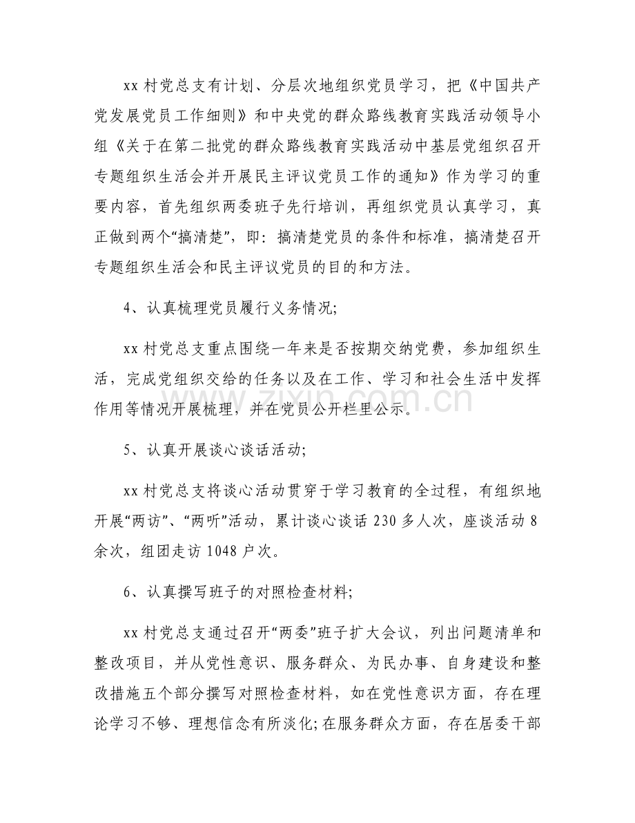 xx村党总支有计划、分层次地组织党员学习,把《中国共产党发展党员工作细则》和中央党的群众路线教育实践活动领导小组《关于在第二批党的群众路线教育实践活动中基层党组织召开专题组织生活会并开展民主评议党员工作的通知》作为学习的重要内容,首先组织两委班子先行培训,再组织党员认真学习,真正做到两个“搞清楚”,即:搞清楚党员的条件和标准,搞清楚召开专题组织生活会和民主评议党员的目的和方法。