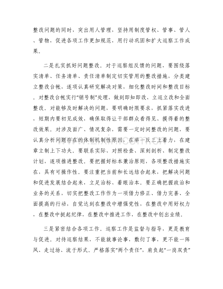 第五巡察组来我****开展工作巡察,是对我们****严格全面的政治体检,是对各项工作的“把脉问诊”。我们要把接受巡察监督作为必修课,把问题整改作为“必答题”,会后,我们将召开班子扩大会议深入分析原因、仔细查找症结,及时研究整改措施,要成立整改工作领导机构,抓紧制定整改方案,迅速行动,立行立改,坚决整改到位。一是已经整改完成的事项,不能改后重犯。在边巡边改过程中,我们已经按照巡察组要求,对一些普遍存在的问题,及时进行了整改,大多初见成效。习近平总书记对巡察整改要求“知错就改,不贰过,看到实质性变化”。“不贰过”比知错就改难度更大,需要足够的意志和自觉。所以,我们要把功夫下在“不贰过”上,警钟长鸣,整章建制,严格自律,加强督查,避免重蹈“发现就改、改后就忘、忘了又犯”的覆辙。二是正在整改之中的事项,不能避实就虚。巡察组交办件中,有些问题比边巡边改的问题要复杂一些,需要更长的时间,我们要按巡察组的要求进行整改。对这类问题,要认真查清事实,分析原因,积极整改,不能避实就虚,要一项一项地拉单子,一条一条地定措施,一件一件抓落实,并加强对整改全过程的监督,定时对账盘点,限时整改销号,确保反馈的情况件件有着落、事事有回音。三是要坚决整改。做到“五不”:即不甩手,我作为农投集团目前主要负责人,我会坚决负起第一责任人责任,各分管领导要负起分管领域的整改责任,担当作为,以上率下。切实落实全面从严治党和党风廉政建设责任;不争论,对出现的问题,都是农投集团需要担下的问题,不管发现的时间多久,不管哪个时期出现问题,都要全面整改;不回避,对具备条件的,立即整改,立见成效;不推脱,对通过努力能够解决的问题,立即研究,限期整改,限期落实;不掩饰,对需要长期努力解决的,要逐个研究,逐步到位,决不能不闻不问,同时,严格跟踪督办,盯紧抓实,坚决、彻底整改到位。