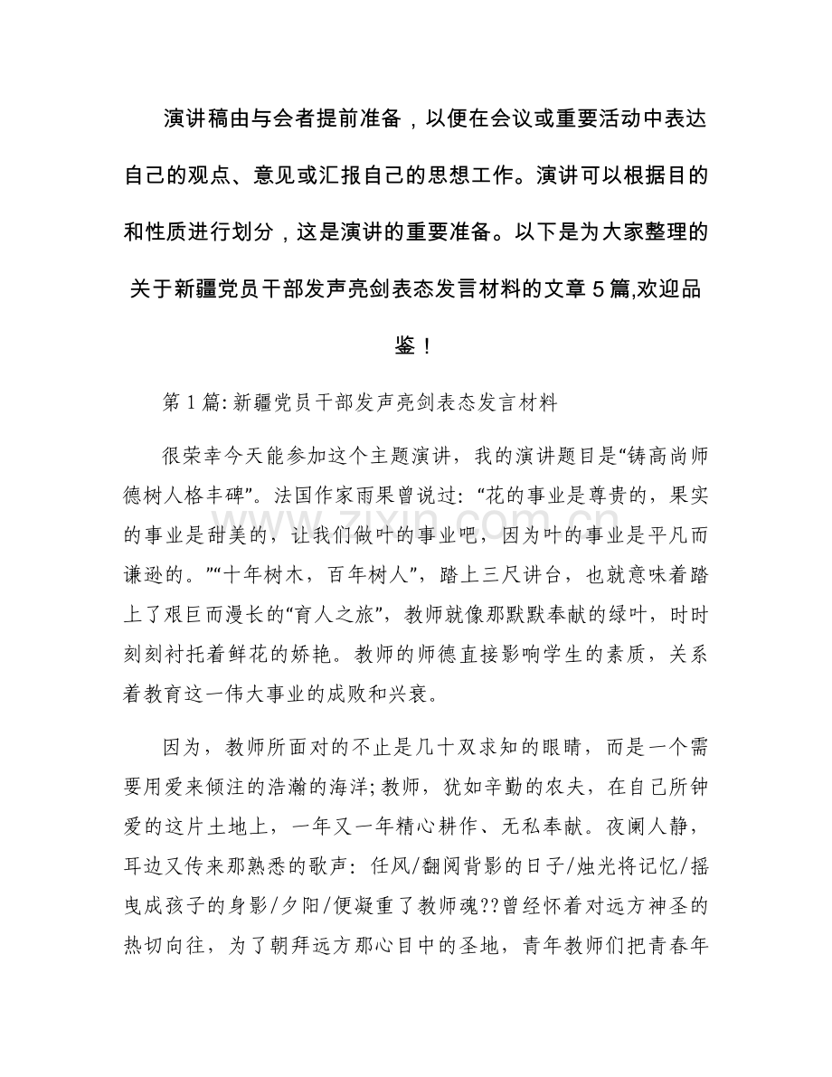 演讲稿由与会者提前准备,以便在会议或重要活动中表达自己的观点、意见或汇报自己的思想工作。演讲可以根据目的和性质进行划分,这是演讲的重要准备。以下是为大家整理的关于新疆党员干部发声亮剑表态发言材料的文章5篇,欢迎品鉴!