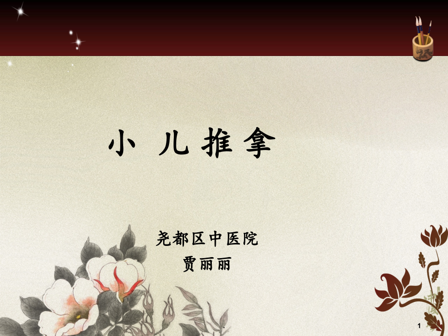 按一下以編輯母片標題樣式,按一下以編輯母片,第二層,第三層,第四層,第五層,*,.,*,按一下以編輯母片標題樣式,按一下以編輯母片,第二層,第三層,第四層,第五層,*,.,*,小 儿 推 拿,尧都区中医院,贾丽丽,1,.,推拿的作用原理,推拿的作用原理,1.,疏通经络,。,黄帝内经,里说:“经络不通;病生于不仁,治之以按,摩”,说明按摩有疏通经络的作用。,2.,调和气血,。,3.,提高机体免疫能力,。如小儿痢疾,经推拿时症状减轻或消失;小儿肺部,有干湿性罗音时,按揉小横纹。掌心横纹有效。,2,.,推拿的适应症和禁忌症(推拿的总论),推拿的适应症和禁忌症,适应症,禁忌症,各种关节炎,肩周炎 急性,传染病,患者,颈椎病 急性疾病病情危重者,急慢性软组织损伤,骨折,未愈合者,腰椎间盘突出 血液病有,出血倾向,者,头晕,头痛,失眠 治疗部位严重,皮肤病,坐骨神经痛 年老体弱,,血压高,神经衰弱 结核,,恶性肿瘤,患者,肠胃功能紊乱 脏器有损害者,妇女,妊娠,期,,月经,期,饭后半小时,,久饿,酗酒,3,.,小儿推拿的适应症,1.,腹泻,2.,提高小儿免疫力,4,.,(三)腰背部穴,1,、脊柱,位置:大椎至长强成一直。,操作:用食中二指面自上而下作直推,称,推脊,,一般,100,300,次。用捏法自下而上作捏法称,捏脊,,一般,3,5,遍。,主治:发热,惊风,夜啼,疳积,腹泻,呕吐,腹痛,便秘等。,5,.,临床运用:,捏脊法可,调阴阳,理气血,和脏腑,通经络,培元气,具有强身健体的功能。,与补脾经,推三关,摩腹,按揉足三里配合,可疗小儿疳积,脾虚泄泻,便秘,四肢无力面黄肌瘦及先后天发育不足的慢性病症。,推脊法从上至下,配天河水,退六腑,推涌泉穴合用可起,清热的作用。,6,.,二、小儿推拿手法,(一)捏脊法,【,概述,】,用拇指挠侧缘顶住皮肤,食、中指前按,三指同时用力提拿皮肤,双手交替捻动向前或食指屈曲,用食指中节挠侧顶住皮肤,拇指前按,两指同时用力提拿皮肤,双手交替捻动向前。,7,.,三指捏,二指捏,8,.,【,动作要领,】,操作时捏起,皮肤多少,及,提拿用力大小,要适当,而且不可,拧转。捏得太紧,不容易向前捻动推进,捏少了则不易提起,皮肤,捻动向前时,需作直线前进,不可歪斜,。,9,.,【,应用,】,本法主要沿夹脊,“,线,”,状部位,因为能在脊背部治疗溶积等,故称为,“,捏脊疗法,”,,治疗小儿积滞、溶积、厌食、腹泻、呕吐等症有特效。操作时,,可捏三下提拿一下,称之为,“,捏三提一法,”,。,本法具有,调和阴阳,健脾和胃,疏通经络,行气活血,作用。根据病情需要,在捏脊过程中,可以一一提拿膀胱经的有关腧穴,则可取得更为满意的疗效。,10,.,2,、七节骨,位置:,第四腰椎至尾椎骨端(长强)成一直线,。,操作:,用,拇指桡侧面,或食中二指面,自下向上或自上而下推,,,分别称为,推上七节和推下七节,。,100,300,次。,主治:,泄泻,便秘,脱肛。,11,.,临床运用:,推上七节骨能,温阳止泻,多用于虚寒腹泻,久痢等症,。推上节,按揉百会,揉丹田合用:气虚下陷的脱肛,遗尿等。,推下七节骨能泻热通便,用于肠热便秘证、痢疾等症。,12,.,腹泻的小儿取穴!,3,、龟尾:,位置:尾椎骨端(相当于长强穴)。,操作:拇指端或中指端揉,称,揉龟尾,,,100,300,。,主治:泄泻,便秘,脱肛,遗尿等。,临床运用:揉龟尾能,通调督脉之气,调理大肠的功能,。揉龟尾,揉脐,推上七节骨合用:腹泻便秘。,“,龟尾七节,摩腹揉,脐,”,乃小儿腹泻之通法。,(二)不均衡质,13,.,临床运用:,补脾经能,健脾胃,补气血,,用于脾胃虚弱,气血不和而引起的食欲不振,肌肉消瘦、消化不良等症。,清脾经能清热利湿,化痰止呕。用于湿热重蒸,皮肤发黄,恶心呕吐,腹泻痢疾等症。,但小儿脾胃薄弱,不宜攻伐太甚,一般多用补法体壮邪实者方能用清法。,小儿体虚或正气不足,患斑疹热病时,推补本穴可使陷疹透出,但手法宜快,用力宜重。,14,.,小儿腹泻,伤食泻,(二)伤食泻,1,、伤食泻,主要症状:腹泻腹胀,泻前哭闹,泻后痛减,大便量多酸臭,伴纳呆,口臭,腹痛,呕吐酸馊。苔厚或垢腻,脉滑。,治疗原则:消食导滞,和中助运。,处方:揉中脘,摩腹,揉天枢,运内八卦,清大肠,揉板门。,15,.,常用手法,16,.,寒湿泻,2,、寒湿泻,主要症状:大便清稀多沫,色淡不臭,肠鸣腹痛,口不渴,,小便清长,面色淡白。舌苔白腻或薄白,脉濡,指纹色红。,治疗原则:温中散寒,化湿止泻。,处方:推三关,揉外劳宫,清大肠,推上七节骨,揉龟尾。,17,.,寒湿泻手法,18,.,湿热泻,3,、湿热泻:,主要症状:腹痛即泻,急迫暴注,色黄褐热臭,伴身热,口渴小便黄赤。舌苔黄腻,脉象滑,数,指纹色紫。,治疗原则:清热利湿,调中止泻。,处方:清脾胃,清大肠,退六腑,下推七节骨,揉龟尾。,19,.,湿热泻的常用小儿推拿手法!,20,.,脾虚泻的常用手法!,2,、脾胃虚弱:,主要症状:面色萎黄或恍白,毛发枯黄稀疏,骨如柴,寐差,精神萎靡,啼声低弱,腹部凹陷,便溏。舌质淡红,苔薄白,脉象沉细无力,指纹色淡。,治疗原则:温中脾健,补益气血。卦,掐揉四横纹、按揉足三里,揉中脘,捏脊。,21,.,谢 谢,22,.,