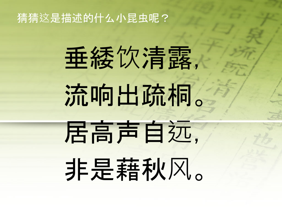 单击此处编辑母版标题样式,单击此处编辑母版文本样式,第二级,第三级,第四级,第五级,昆虫与蘑菇的认知,北京林业大学林学院,紫藤萝暑期社会实践团,猜猜这是描述的什么小昆虫呢?,垂緌饮清露,,流响出疏桐。,居高声自远,,非是藉秋风。,蝉,古代人认为蝉吸风饮露,不食人间烟火,所以常常用蝉来比喻清廉高洁的形象。,但是现代昆虫学研究表明:蝉通过它特殊的嘴巴(刺吸式口器)来吸食植物的汁液。,昆虫,什么是昆虫呢?,古文中:昆者,众也;昆虫就是世上众多动物。,现在含义:昆虫特指分类系统中昆虫纲中的物种。,昆虫特征:头、胸、腹三节;一对触角;两对翅膀;三对足。(并非绝对),一对触角,三对足,二对翅膀,螳螂,蝴蝶,天牛,绿尾大蚕蛾,这些是不是昆虫呢?,蜈蚣不是昆虫,还记得昆虫的定义吗?,一对触角,三对足,二对翅膀,蜘蛛是昆虫吗?,蜘蛛不是昆虫,蜘蛛都是八条腿。,蚂蚁是昆虫吗?,蚂蚁是昆虫,为什么这张图里面的蚂蚁没有翅膀呢?,蚂蚁是社会性昆虫,会进化出各种形态的有不同功能的蚂蚁,有工蚁、兵蚁、蚁后,都有不同的形态。,小龙虾是昆虫吗?,小龙虾不是昆虫。,你们知道哪些成语中带有昆虫吗?,比如:千里之堤毁于蚁穴,薄如蝉翼、蚕食鲸吞、蚕头燕尾、朝生暮死、春蚕到死丝方尽,蠢蠢欲动、断肢自救、蛾眉皓齿、飞蛾扑火、蜂缠蝶恋,蜂目豺声、蜂拥而上、蜂拥而来、户枢不蠹、蠖屈求伸,金蝉脱壳、噤若寒蝉、聚蚁成雷、蚂蚁啃骨头、螟蛉之子,囊萤映雪、蚍蜉撼树、千里之堤,溃于蚁穴、蜻蜓点水,群蚁附膻、热锅上的蚂蚁、螳臂当车、螳螂捕蝉,黄雀在后,捅马蜂窝、蜕化变质、猬结蚁聚、无头苍蝇、夏虫不语冰,一条线拴两蚂蚱、一窝蜂、蝇头小利、蝇营狗苟、作茧自缚,欣赏实习采集的昆虫标本,形态各异的蘑菇,蘑菇有根、茎、叶吗?它是怎么吸收养分的?,蘑菇没有根、茎、叶,它靠一部分菌丝伸入地下来吸收现成的有机养料。,山上遇到哪些蘑菇呢?,地星,皮伞,长在地上,需要仔细观察才能看到的皮伞。,幅条盖杯伞,杯伞,像喝水用的杯子一样。,大马勃,马勃里面的粉末可以用来止血。,鬼伞,宽鳞菱孔菌,灰鹅膏,木耳,这就是我们常吃的木耳啦。,大孔菌,是不是菌如其名呢?,仙女环,蘑菇在自然条件下长成环状,叫做仙女环。这样的蘑菇常常是能吃的。,野外遇到什么样的蘑菇能吃呢?,野外遇到的蘑菇尽量不要带回家食用。,第一,很多有毒的蘑菇长得跟无毒的蘑菇难以区分;,第二,大量采集能吃的蘑菇会一定程度上的破坏生态平衡。,THANKS,!,