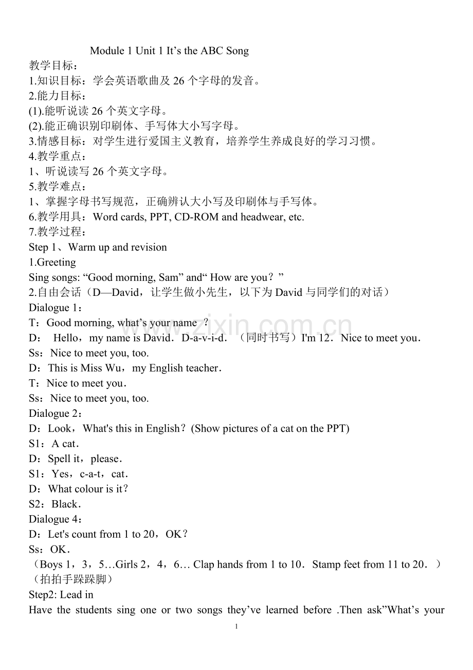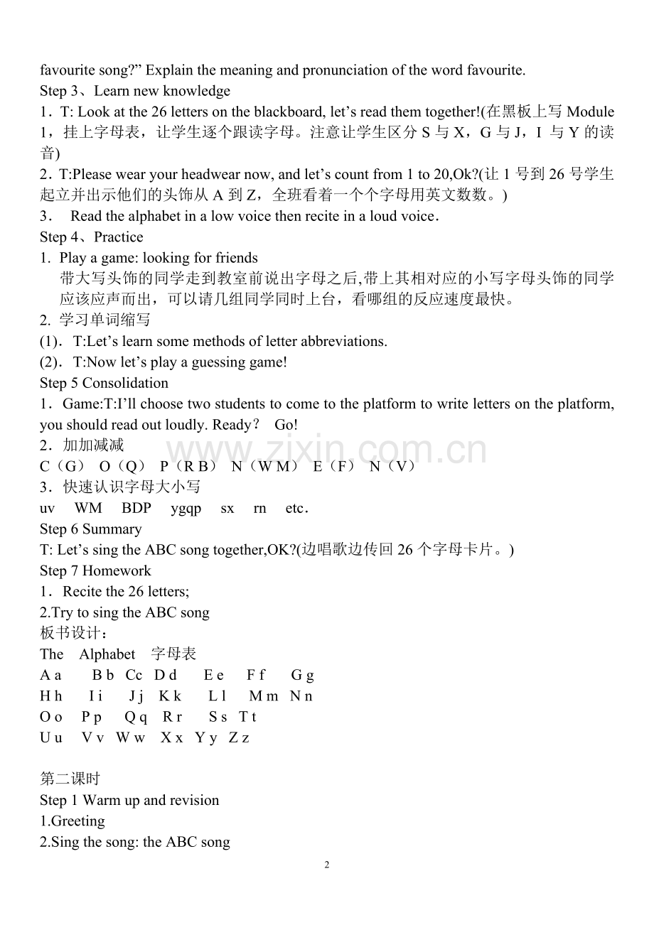 1.T: Look at the 26 letters on the blackboard, let’s read them together!(在黑板上写Module 1,挂上字母表,让学生逐个跟读字母。注意让学生区分S与X,G与J,I 与Y的读音)
