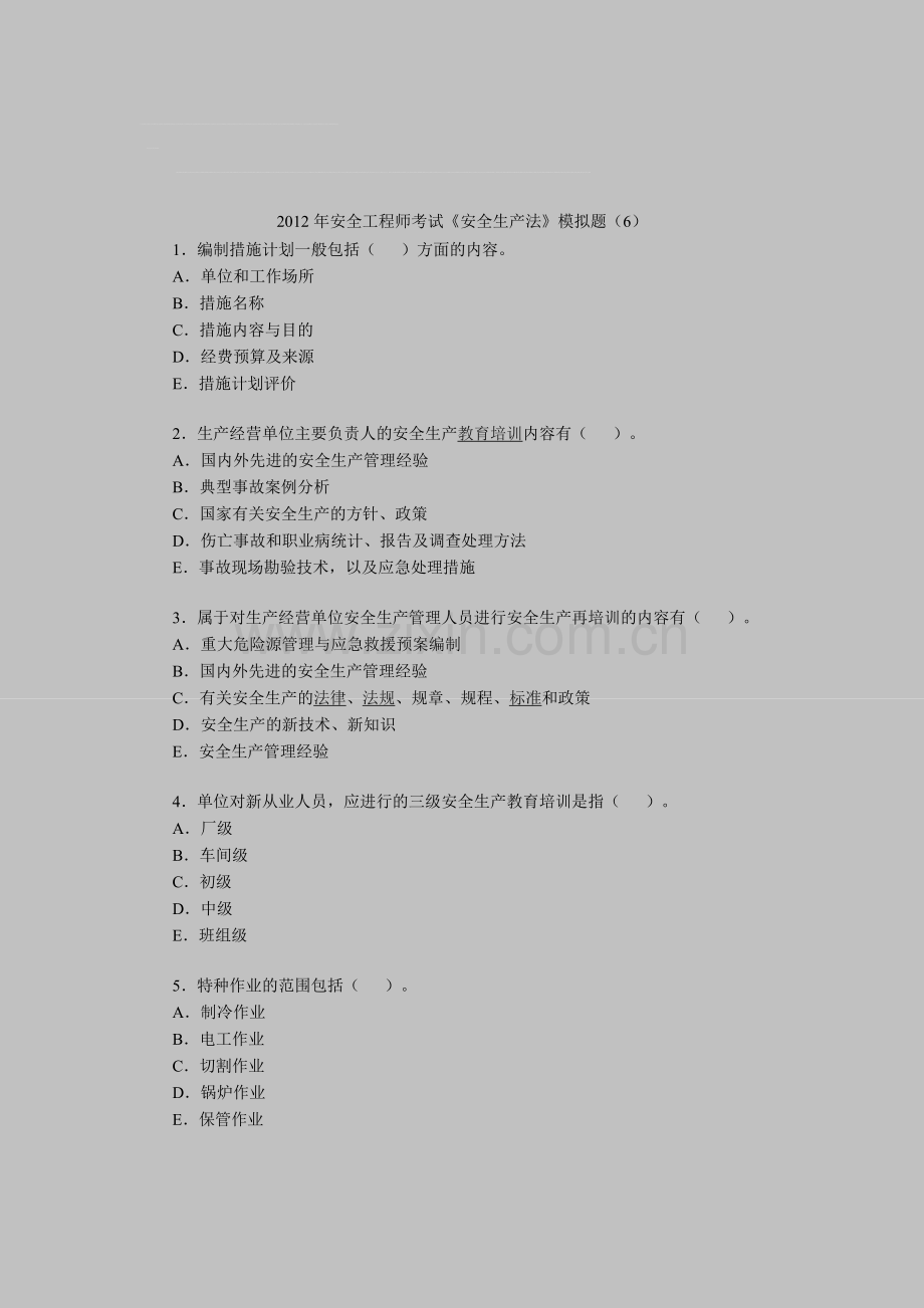 2012年安全工程师考试《安全生产法》模拟题(6)