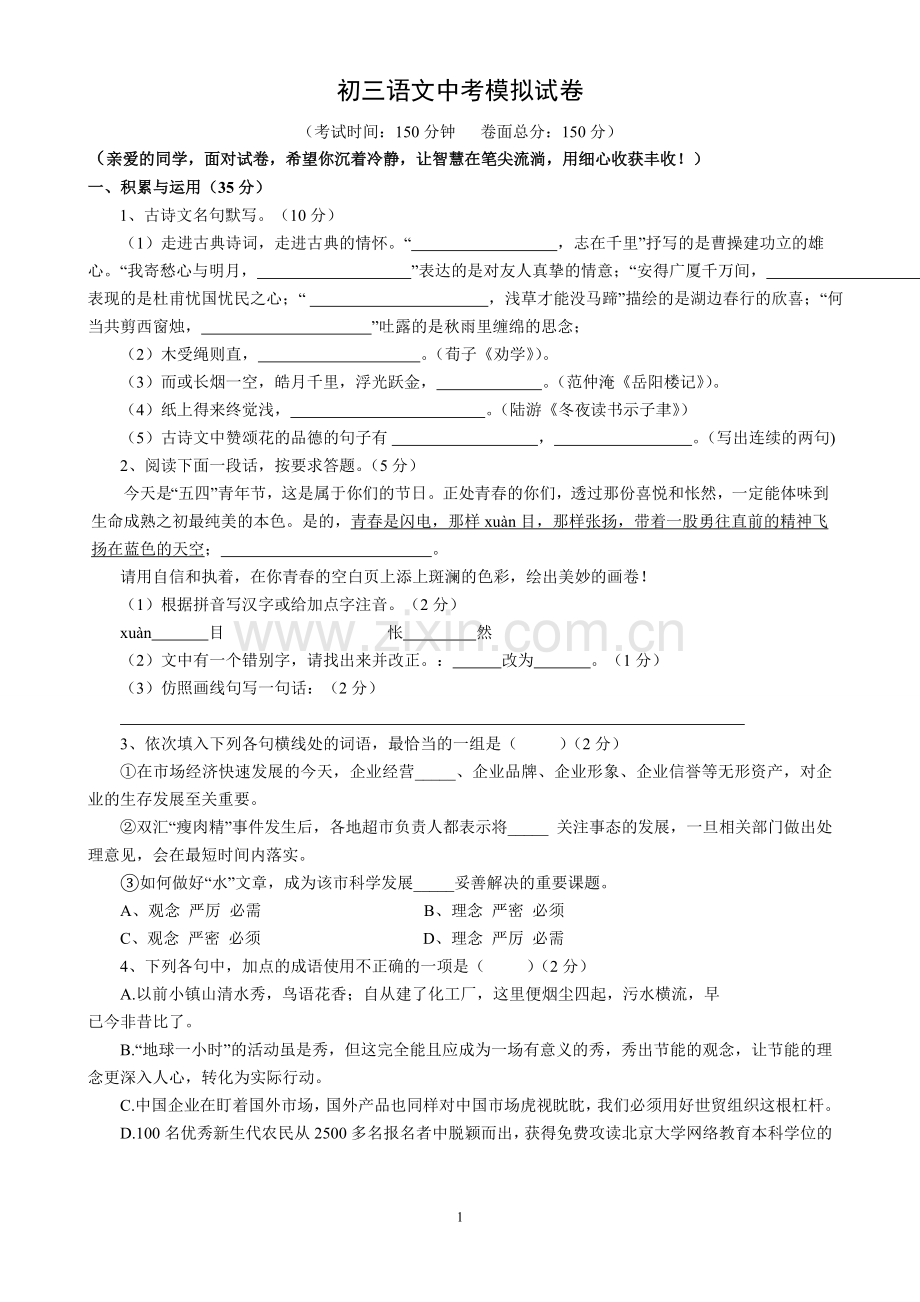 初三语文中考模拟试卷