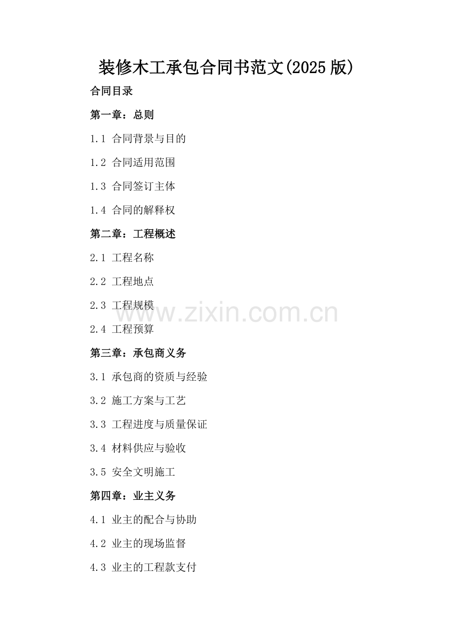 1.1 合同背景与目的:本合同是甲方(业主)与乙方(承包商)就位于_________的工程进行装修木工承包的协议。
