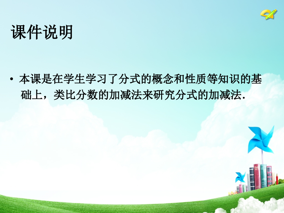 单击此处编辑母版标题样式,单击此处编辑母版文本样式,第二级,第三级,第四级,第五级,*,*,*,15.2.2 分式的加减,第1课时 分式的加减,课件说明,本课是在学生学习了分式的概念和性质等知识的基,础上,类比分数的加减法来研究分式的加减法,学习目标:,1,理解分式的加减法法则,体会类比思想,2,会运用法则进行分式的加减运算,体会化归思想,学习重点:,分式的加减法法则,课件说明,感受学习分式加减法的必要性,问题,1,甲工程队完成一项工程需,n,天,乙工程队要,比甲队多用,3,天才能完成这项工程,两队共同工作一天,完成这项工程的几分之几?,(,1,)甲工程队一天完成这项工程的几分之几?,(,2,)乙工程队一天完成这项工程的几分之几?,(,3,)甲乙两队共同工作一天完成这项工程的几分之几?,感受学习分式加减法的必要性,问题,2,2009,年、,2010,年、,2011,年某地的森林面积,(单位:,km,2,)分别是,S,1,,,S,2,,,S,3,,,2011,年与,2010,年相比,森林面积增长率提高了多少?,(,1,)什么是增长率?,(,2,),2010,年、,2011,年的森林面积增长率分别是多少?,(,3,),2011,年与,2010,年相比,森林面积增长率提高了多,少?,探索分式的加减法法则,分式的加减法与分数的加减法类似,它们实质相,同观察下列分数加减运算的式子,你能将它们推广,,得出分式的加减法法则吗?,探索分式的加减法法则,分式的加减法法则:,同分母分式相加减,分母不变,把分子相加减;,异分母分式相加减,先通分,变为同分母的分式,,再加减,运用分式的加减法法则,解:,例计算:,运用分式的加减法法则,解:,例计算:,课堂练习,练习,1,计算:,课堂练习,练习,2,计算:,课堂练习,练习,3,你能应用本节课所学知识解决,“,问题,1,”,和,“,问题,2,”,吗?,运用分式的加减法法则,问题,1,甲工程队完成一项工程需,n,天,乙工程队要,比甲队多用,3,天才能完成这项工程,两队共同工作一天,完成这项工程的几分之几?,解:,即两队共同工作一天完成这项工程的,问题,2,2009,年、,2010,年、,2011,年某地的森林面积,(单位:,km,2,)分别是,S,1,,,S,2,,,S,3,,,2011,年与,2010,年相,比,森林面积增长率提高了多少?,运用分式的加减法法则,解:,问题,2,2009,年、,2010,年、,2011,年某地的森林面积,(单位:,km,2,)分别是,S,1,,,S,2,,,S,3,,,2011,年与,2010,年相,比,森林面积增长率提高了多少?,运用分式的加减法法则,解:,即,2011,年与,2010,年相比,森林面积增长率提,高了,课堂小结,(,1,)本节课学习了哪些主要内容?,(,2,)我们是怎么引出分式加减法法则的?,(,3,)在进行分式的加减运算时要注意哪些问题?,谢谢,