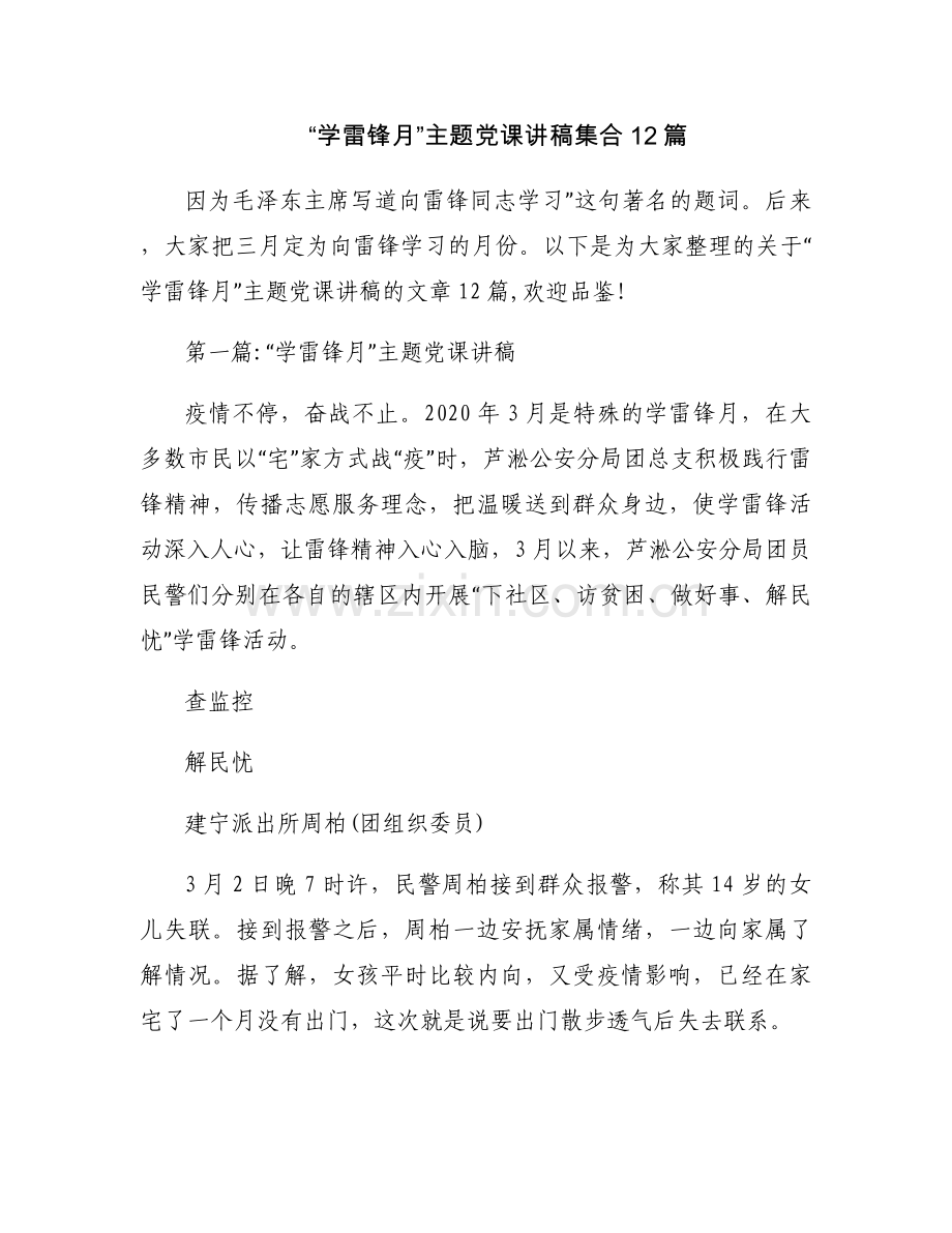 因为毛泽东主席写道向雷锋同志学习”这句著名的题词。后来,大家把三月定为向雷锋学习的月份。以下是为大家整理的关于“学雷锋月”主题党课讲稿的文章12篇,欢迎品鉴!