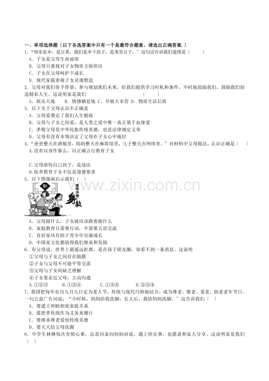 9.“老人不图儿女为家做多大奉献,一辈子不容易,就图个团团圆圆。〞这说明父母〔 〕