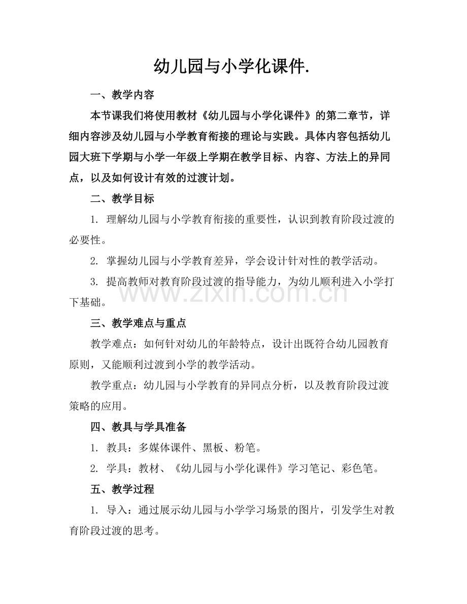 本节课我们将使用教材《幼儿园与小学化课件》的第二章节,详细内容涉及幼儿园与小学教育衔接的理论与实践。具体内容包括幼儿园大班下学期与小学一年级上学期在教学目标、内容、方法上的异同点,以及如何设计有效的过渡计划。
