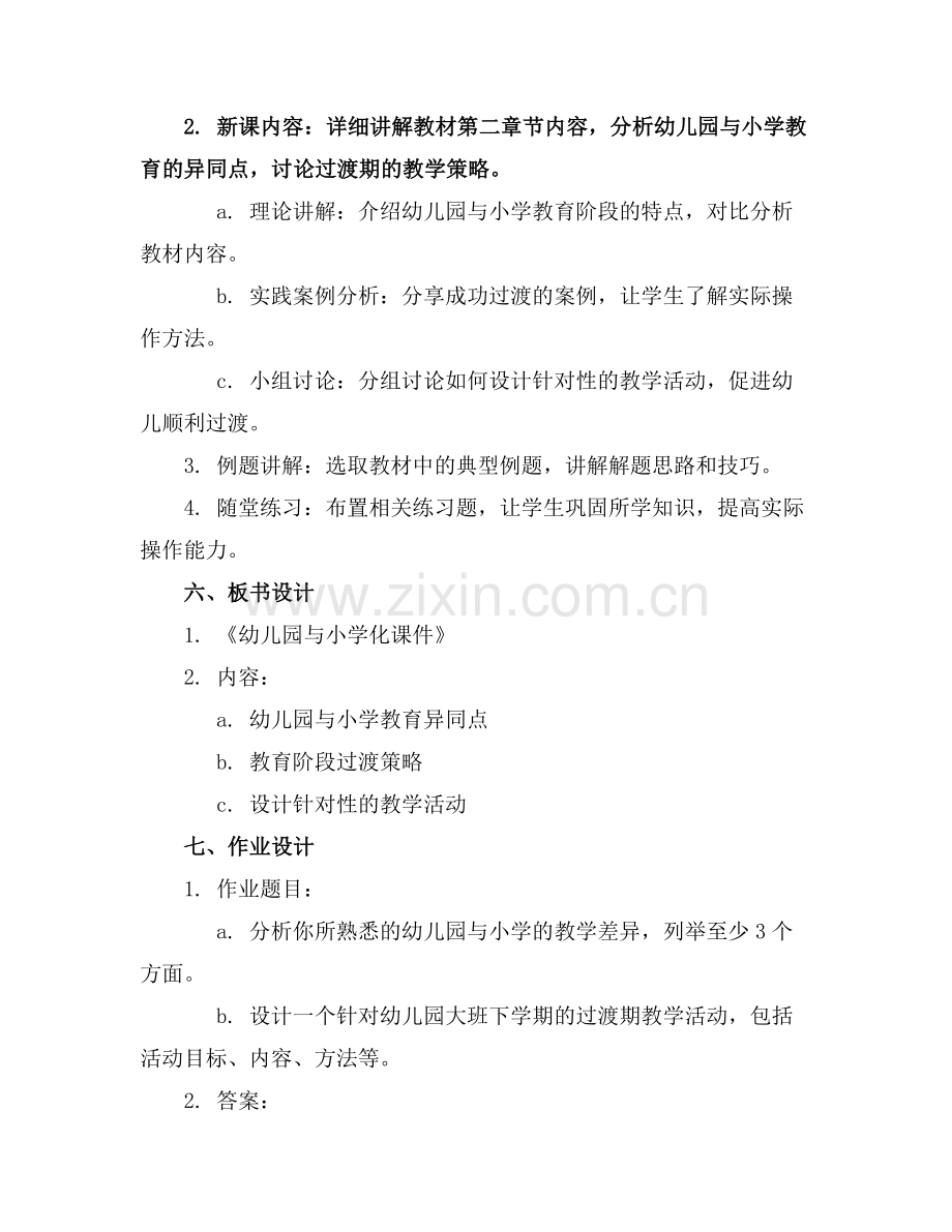 2. 新课内容:详细讲解教材第二章节内容,分析幼儿园与小学教育的异同点,讨论过渡期的教学策略。