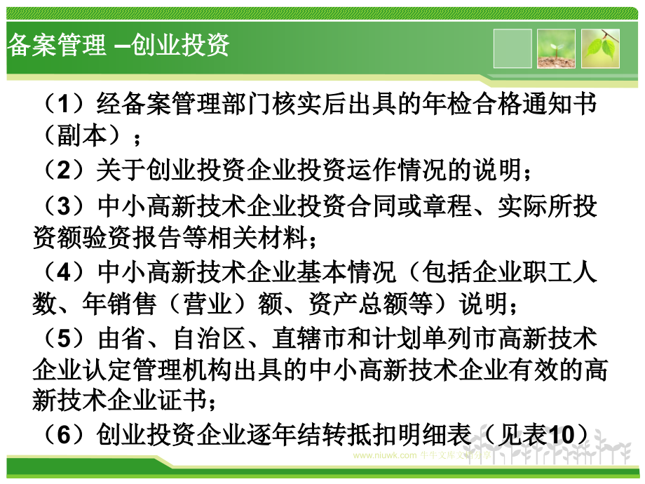 ,单击此处编辑母版标题样式,单击此处编辑母版文本样式,第二级,第三级,第四级,第五级,#,单击此处编辑母版标题样式,单击此处编辑母版文本样式,第二级,第三级,第四级,第五级,#,单击此处编辑母版标题样式,单击此处编辑母版文本样式,第二级,第三级,第四级,第五级,#,备案管理,创业投资,(,1,)经备案管理部门核实后出具的年检合格通知书(副本);,(,2,)关于创业投资企业投资运作情况的说明;,(,3,)中小高新技术企业投资合同或章程、实际所投资额验资报告等相关材料;,(,4,)中小高新技术企业基本情况(包括企业职工人数、年销售(营业)额、资产总额等)说明;,(,5,)由省、自治区、直辖市和计划单列市高新技术企业认定管理机构出具的中小高新技术企业有效的高新技术企业证书;,(,6,)创业投资企业逐年结转抵扣明细表(见表,10,),牛牛文库文档分享,备案管理,创业投资,牛牛文库文档分享,备案管理,非居民企业低税率优惠,(,1,)非居民企业信息资料或相关身份证明;,(,2,)与取得所得有关的产权书据、合同、协议、支付凭证等权属证明或者中介、公证机构出具的相关证明。文本为外文的,应同时附送中文译本;,(,3,),扣缴企业所得税合同备案登记表,;,(,4,),中华人民共和国扣缴企业所得税报告表,;,牛牛文库文档分享,备案管理,非营业组织收入,(,1,)非营利组织认定证书;,(,2,)非营利组织收入、支出明细表;,(,3,)财产及孳息的分配使用情况;,(,4,)工作人员工资福利开支情况。,牛牛文库文档分享,备案管理,高新技术,(,1,)高新技术企业证书;,(,2,)当年产品(服务)属于,国家重点支持的高新技术领域,规定的范围的说明;,(,3,)年度研究开发费用结构明细表;,(,4,)当年高新技术产品(服务)收入占企业总收入的比例说明;,(,5,)具有大学专科以上学历的科技人员占企业当年职工总数的比例说明、研发人员占企业当年职工总数的比例说明。,牛牛文库文档分享,备案管理,公共基础设施项目投资,(,1,)有关部门批准该项目文件;,(,2,)该项目投资额验资报告;,(,3,)取得第一笔生产经营收入的会计凭证、发票及账页;,(,4,)公共基础设施项目所得核算明细账或按月汇总表;,(,5,)公共基础设施项目情况及核算说明表(见表,3,);,(,6,)属于优惠期内转让的项目,应提供项目权属变动资料及原享受优惠情况有关资料。,牛牛文库文档分享,备案管理,公共基础设施项目投资,牛牛文库文档分享,备案管理,固定资产加速折旧,(,1,)固定资产的功能、预计使用年限短于,实施条例,规定计算折旧的最低年限的理由、证明资料及有关情况的说明;,(,2,)被替代的旧固定资产的功能、使用及处置等情况的说明;,(,3,)固定资产加速折旧拟采用的方法和折旧额的说明;,(,4,)实行加速折旧的固定资产的入账凭证;,(,5,)固定资产加速折旧台帐(见表,11,)。,牛牛文库文档分享,备案管理,固定资产加速折旧,牛牛文库文档分享,备案管理,国债利息收入,(,1,)国债净价交易交割单;,(,2,)应收利息(投资收益)科目明细账或按月汇总表。,牛牛文库文档分享,备案管理,环境保护节能节水设备,(,1,)有关部门批准该项目文件;,(,2,)财税,2009166,号文件规定的证明材料;,(,3,)该项目投资额验资报告;,(,4,)取得第一笔生产经营收入的会计凭证、发票及账页;,(,5,)税收优惠项目所得核算明细账或按月汇总表;,(,6,)环境保护、节能节水项目情况及核算说明表(见表,4,);,(,7,)属于优惠期内转让的项目,应提供项目权属变动资料及原享受优惠情况有关资料。工资福利开支情况。,牛牛文库文档分享,备案管理,环境保护节能节水设备,牛牛文库文档分享,备案管理,技术先进性服务企业,(,1,)企业法人营业执照;,(,2,)技术先进型服务企业认定文件;,(,3,)产品(服务)属于,技术先进型服务业务认定范围(试行),规定的范围的说明;,(,4,)近两年在进出口业务管理、财务管理、税收管理、外汇管理、海关管理等方面无违法行为的证明;,(,5,)企业具有大专以上学历的员工占企业职工总数的比例说明;,(,6,)企业从事规定范围内的技术先进型服务业务收入总和占本企业当年总收入比例说明;,牛牛文库文档分享,备案管理,技术先进性服务企业,(,7,),企业的有关国际资质认证(包括开发能力和成熟度模型、开发能力和成熟度模型集成、,IT,服务管理、信息安全管理、服务提供商环境安全、,ISO,质量体系认证、人力资源能力认证等),与境外客户签订服务外包合同证明(财税,2010,年,65,号已取消),,及向境外客户提供的国际(离岸)外包服务业务收入占企业当年总收入的比例说明。,牛牛文库文档分享,备案管理,技术转让所得,(,1,)技术转让合同(副本);,(,2,)省级以上科技部门出具的技术合同登记证明(境内转让);,(,3,)省级以上商务部门出具的技术出口合同登记证书或技术出口许可证(向境外转让);,(,4,)技术出口合同数据表(向境外转让);,(,5,)技术转让项目情况及核算说明表(见表,5,);,(,6,)实际缴纳相关税费的证明资料。,牛牛文库文档分享,备案管理,技术转让所得,牛牛文库文档分享,备案管理,农林牧渔,(,1,)产品品目明细表;,(,2,)企业生产经营过程描述;,(,3,)年度收入、支出明细表;,(,4,)税收优惠项目说明及核算情况表(见表,1,、表,2,);,(,5,)税收优惠项目所得核算明细账或按月汇总表。,牛牛文库文档分享,备案管理,农林牧渔,牛牛文库文档分享,备案管理,农林牧渔,牛牛文库文档分享,备案管理,权益性投资收益,(,1,)投资合同或协议书;,(,2,)