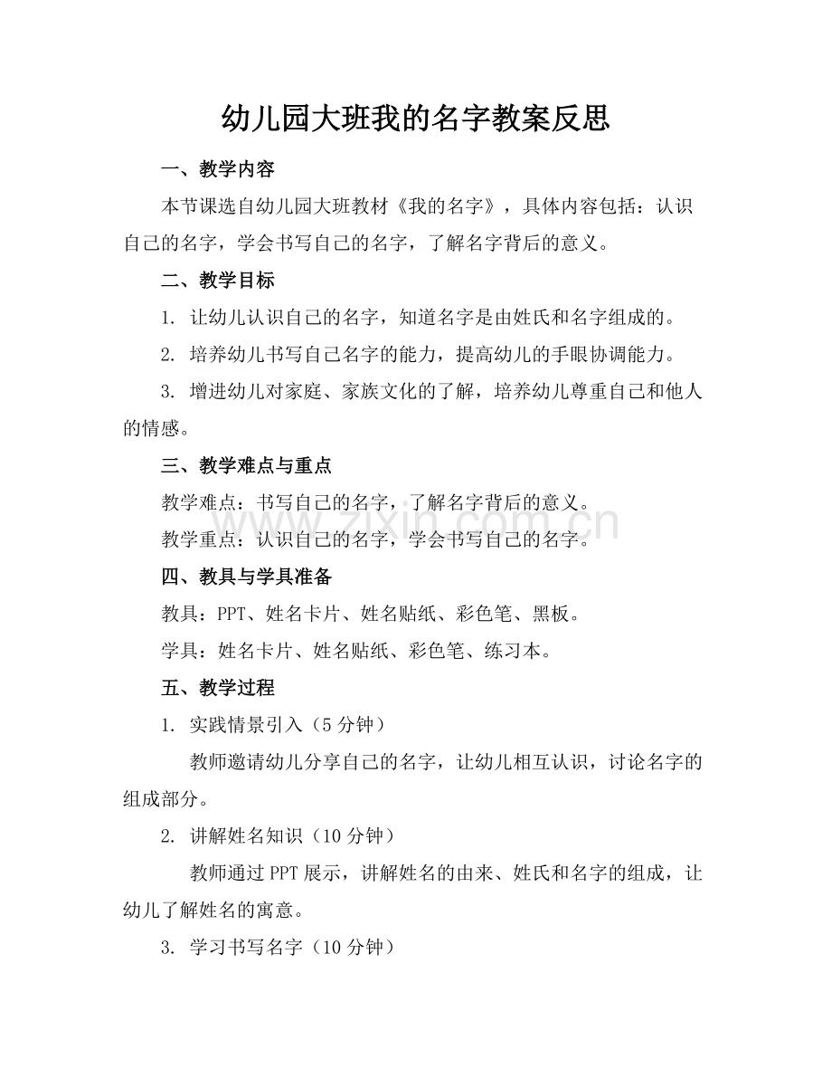 1. 课后反思:本节课通过讲解、示范、练习等方式,让幼儿认识并书写自己的名字,达到了预期效果。但在教学过程中,要注意关注每个幼儿的学习进度,给予个别辅导。