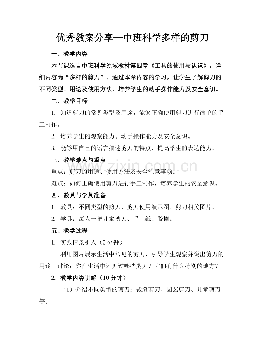 本节课选自中班科学领域教材第四章《工具的使用与认识》,详细内容为“多样的剪刀”。通过本章内容的学习,让学生了解剪刀的不同类型、用途及使用方法,培养学生的动手操作能力及安全意识。