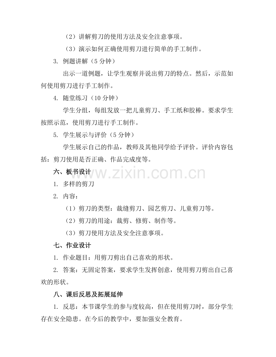 1. 反思:本节课学生的参与度较高,但在使用剪刀时,部分学生存在安全隐患。在今后的教学中,要加强安全教育。