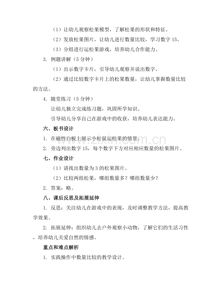 (2)通过发放松果图片,让幼儿进行数量比较,学习数字15。在这一过程中,教师应关注幼儿的操作情况,适时给予指导,帮助他们掌握数量比较的方法。