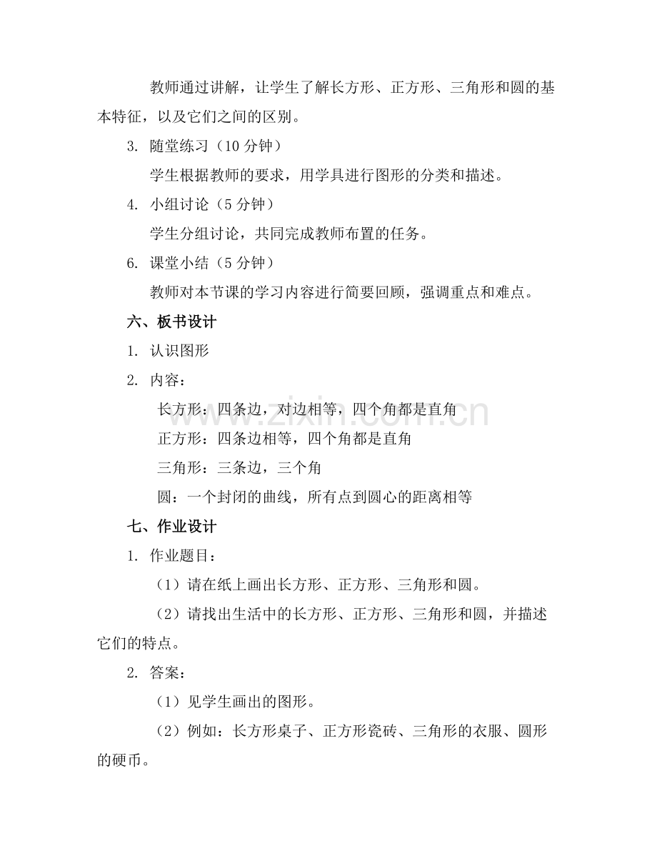 教师通过讲解,让学生了解长方形、正方形、三角形和圆的基本特征,以及它们之间的区别。