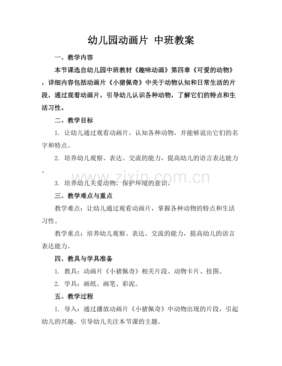 本节课选自幼儿园中班教材《趣味动画》第四章《可爱的动物》,详细内容包括动画片《小猪佩奇》中关于动物认知和日常生活的片段,通过观看动画片,引导幼儿认识各种动物,了解它们的特点和生活习性。