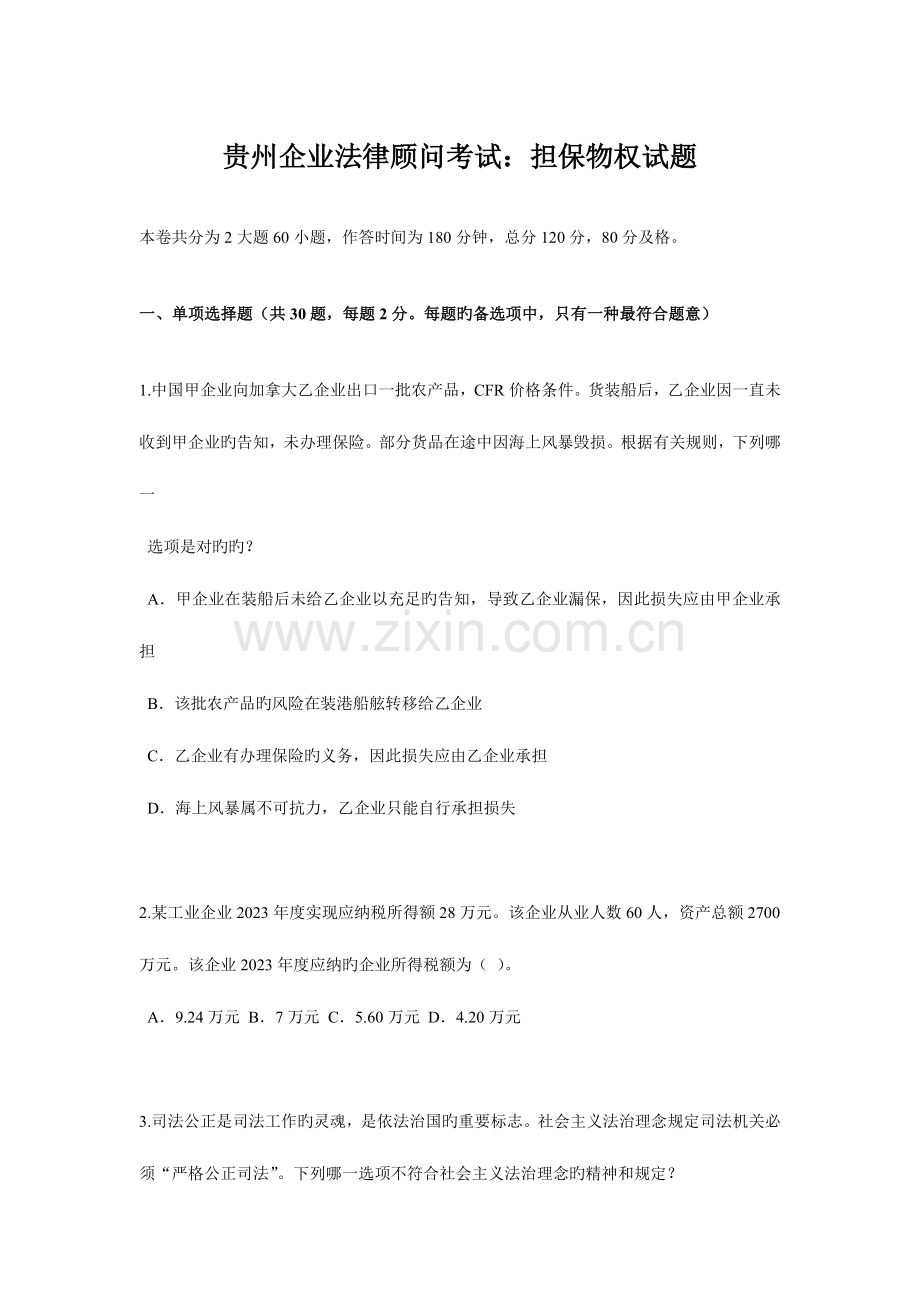 贵州企业法律顾问考试:担保物权试题