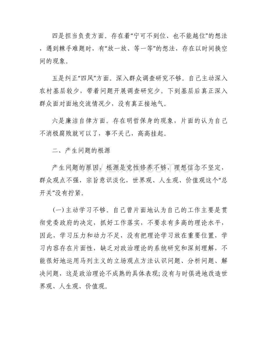 (一)主动学习不够。自己曾片面地认为自己的工作主要是贯彻党委政府的决定,抓好工作落实,不要求有多高的理论水平,因此,学习压力和动力不足,没有把理论学习放在重要位置,学习内容存在片面性,缺乏对政治理论的系统研究和深刻理解,不能很好地运用马列主义的立场观点方法认识问题、分析问题、解决问题,这是政治理论不成熟的具体表现;没有与时俱进地改造世界观、人生观、价值观。
