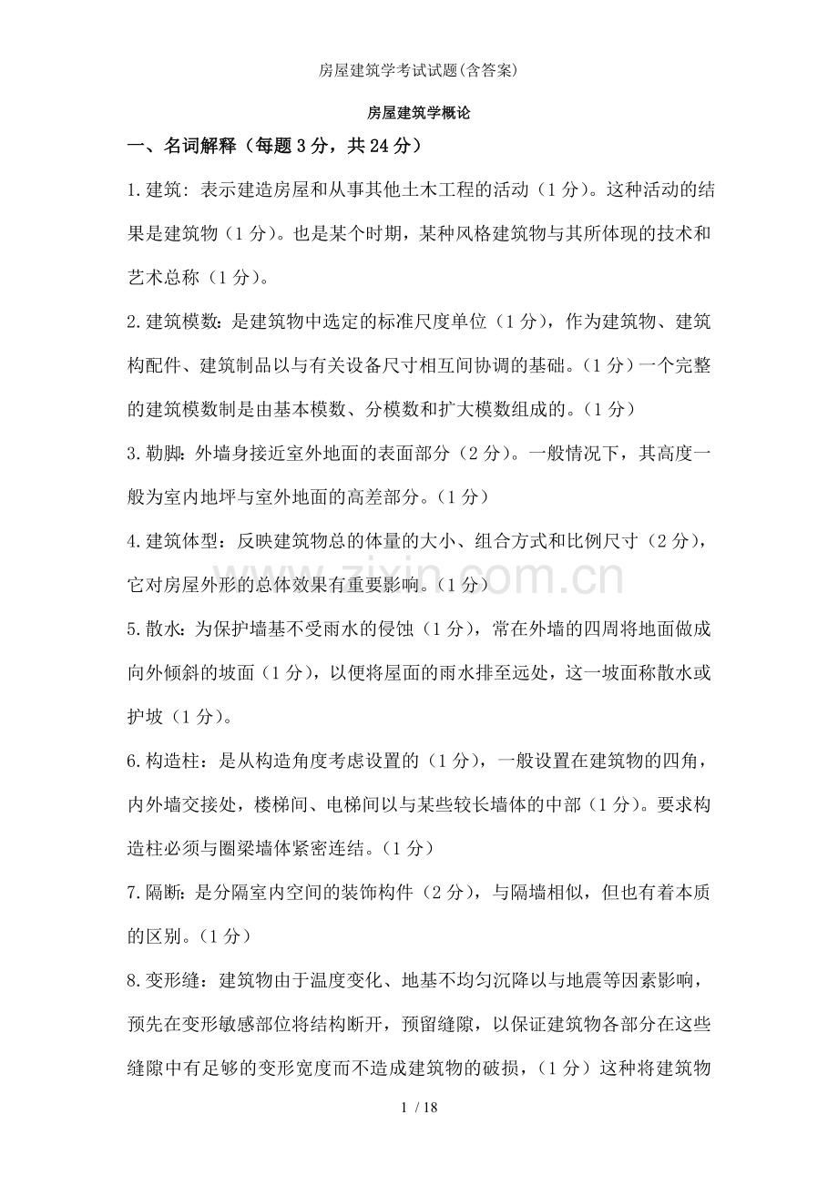 8.变形缝:建筑物由于温度变化、地基不均匀沉降以与地震等因素影响,预先在变形敏感部位将结构断开,预留缝隙,以保证建筑物各部分在这些缝隙中有足够的变形宽度而不造成建筑物的破损,(1分)这种将建筑物垂直分割开来的预留缝称为变形缝。(1分)包括伸缩缝、沉缝缝和防震缝。(1分)