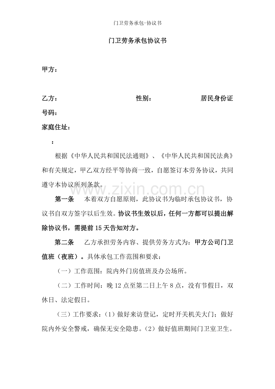 第二条 乙方承担劳务内容、提供劳务方式为:甲方公司门卫值班(夜班)。具体承包工作范围和要求: