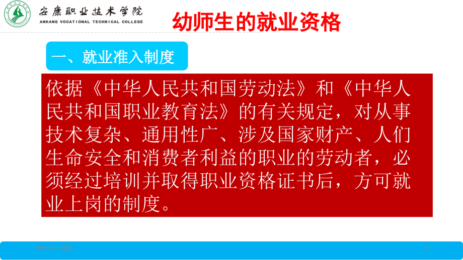 单击此处编辑母版标题样式,单击此处编辑母版文本样式,第二级,第三级,第四级,第五级,2,#,幼儿教师资格考试介绍,2018,年,1,2,一、就业准入制度,幼师生的就业资格,依据,中华人民共和国劳动法,和,中华人民共和国职业教育法,的有关规定,对从事技术复杂、通用性广、涉及国家财产、人们生命安全和消费者利益的职业的劳动者,必须经过培训并取得职业资格证书后,方可就业上岗的制度。,2,2025/6/4 周三,二、教师资格证书,教师资格条例,第一章第二条规定:中国公民在各级各类学校和其他教育机构中专门从事教育教学工作,应当依法取得教师资格并具有相应的教师资格证书。,3,2025/6/4 周三,2,4,2,5,三、幼师生的取证流程,1,、陕西教师资格证考试参加国家统一考试,一年两次,上半年是,1,月份报名,,3,月份笔试,,5,月份面试,下半年是,9,月份报名,,11,月份笔试,次年,1,月份面试。,2,、笔试考试科目包括:,幼儿园,综合素质、保教知识与能力;,小学,综合素质、教育教学知识与能力;,中学以及中职文化课,综合素质、教育知识与能力、学科知识与教学能力;,中职专业课以及中职实习指导,综合素质、教育知识与能力。,6,2025/6/4 周三,2,7,2,8,2,9,2,10,2,11,2,12,2,13,考试内容,14,2025/6/4 周三,/,周三,16,2025/6/4 周三,/,面试报名流程为:网上报名现场信息确认网上缴费。,符合条件的考生须按照面试报名流程,在规定时间内完成报名程序,,逾期不再办理。,使用教育部考试中心面试测评系统面试方法,考生经过候考、抽题、备课、回答规定问题、试讲(演示)、答辩等环节,完成面试,原则上备课时间,20,分钟,面试时间,20,分钟。,17,2025/6/4 周三,一分耕耘,一分收获。,机会只给予有准备的人。,18,2025/6/4 周三,初识,幼儿教师的职业道德,幼儿教师的职业素质,职业素质,劳动者在一定的生理和心理条件的基础上,通过教育、劳动实践和,自我修养等途径形成和发展起来的,在职业活动中发挥重要作用的,内在基本品质。,19,2025/6/4 周三,树立正确的儿童观和教育观,应当怀着强烈的使命感和责任心,去尊重儿童、了解儿童、热爱儿童、教育儿童,创造环境和设计活动,事事处处充分发挥儿童的积极性、主动性、创造性。,具有高尚的职业道德,热爱幼教事业,对幼儿充满爱心,对教育充满热情,是教师首先必备的职业行为准则。,具有娴熟的专业知识和技能,要有能够透析儿童内心世界的洞察力;有清楚、生动、简明、富于感染力的语言表达能力;能创造性地设计各项活动的教育、教学能力;不断完善与提高自身的学习能力;协调园内外关系的实际能力等等。,一,.,幼儿教师的职业素质,职业素养,职业,价值观,职业道德,专业知识和技能,20,2025/6/4 周三,21,2025/6/4 周三,有高度的责任心和事业心,应认真负责,热爱尊重每一个幼儿;有良好的敬业精神和献身精神,勇于吃苦,为了工作不计较个人得失;能意识到自己的工作与幼儿园、企业、国家的命运、前途和社会发展的关系。,具有严谨治学,勇于探索的精神,在教学和科研活动中求精、求实、求真、求美,勇于探索,以实事求是。科学严肃和认真负责任的态度对待自己的工作,提高教育教学水平。,尊重家长,互相配合,1.,加强与家长的联系,调动家长在培养孩子全面发展上的积极性。,2.,对家长以诚相待,以礼相见,互敬互重。,3.,尊重家长,虚心倾听家长意见,不挫伤家长的感情,不训斥家长。,二,.,幼儿教师的职业道德,22,2025/6/4 周三,加强师德师风教育,培养教师良好的职业道德,幼儿教师只有对这份职业和每个幼儿充满热爱,具有了良好的职业道德,才会用心工作,教育好幼儿。要牢固树立“园衰我耻,园兴我荣,爱岗敬业、乐于幼教,幼儿成长,责无旁贷”的思想,一积极主动的态度全身心投入工作。,加强理论与实践相结合是职业道德培养的根本途径,1.,学习马克思主义理论。,2.,学好教育理论和职业道德理论。,3.,在实践教育教学活动中提高道德修养。,幼儿教师职业道德的提高贵在自觉,道德作为一定社会对人们的行为规范,主要靠人们发自觉自愿才能真正起到作用。道德修养是人们道德品质的自我锻炼、自我教育和自我陶冶,因此,更需要具有自觉性。,三,.,幼儿教师职业道德的培养途径,23,2025/6/4 周三,作业:,幼儿教师需要具备的职业资格证书,报名条件及网址?,24,2025/6/4 周三,
