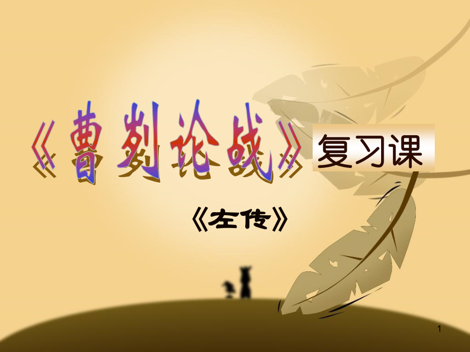 单击此处编辑母版标题样式,单击此处编辑母版文本样式,第二级,第三级,第四级,第五级,*,曹刿论战,复习课,左传,1,掌握文中的重点实词、虚词;,掌握文中的重点句子及特殊句式;,综合理解课文内容。,学会总结 学会迁移,抓住规律 举一反三,复习目标:,复习方法:,2,关于,左传,本文选自,,这是我国第,一部,_,体史书。旧传为春秋时期,_,所作,是一部,名著和,名著。,左 传,编 年,左丘明,史 学,文 学,3,文言实词,通 假 字,词 类 活 用,古 今 异 义,一 词 多 义,复习重点一,4,1.,小惠未,徧,(),通,“,遍,”,遍及,普遍。,通假字,5,1.,公将鼓之,2,、神弗福也,鼓:名词作动词,击鼓进军。,词类活用,福:名词作动词,赐福保佑。,6,牺牲,玉帛,弗敢加也,必以信。,古义:,今义:,忠之属也。,可以,一战。,古义:今义:,肉食者谋之,又何,间,焉?,古义:今义:,小大之,狱,,虽不能察,必以情。,古义:今义:,祭祀用的猪、牛、羊等祭品,为正义事业舍弃生命,引申为丢弃某种利益,可以凭借,表示可能,许可,参与,隔开,不连接,案件,官司,监牢,古今异义,7,吾视其辙乱,望其旗靡,,故,逐之,故,既克,公问其,故,民弗,从,也,从,战则请,从,既克,公问,其,故,其,吾视,其,辙乱,其,乡人曰,(所以),(缘故,原因),(听从),(跟随),(这样,如此),(他们的,指齐军的),(他的,指曹刿的),一词多义,8,之,肉食者谋,之,忠,之,属也,公将驰,之,以,何,以,战,必,以,情,必,以,分人,代词,指这件事。,助词,的。,助词,无实意。,凭借,按照,把,9,注意特殊句式,(,如,倒装句,、,判断句,等,),1.,何以战,?,凭借什么作战,?,2.,夫战,勇气也。,作战,是靠勇气的。,3.,必以分人。,“,以”后省略宾语“之”。,10,1.,肉食者,谋之,又何,间,焉?,2,、肉食者,鄙,,未能远谋。,3,、,牺牲,玉帛,弗敢,加,也,必以,信,。,4.,小大之,狱,虽,不能察,必以,情,。,5,、,忠,之属也,,可以,一战。,6,、夫战,勇气也。,7.,一,鼓,作气,再,而衰,三而竭。,语句释义,复习重点三,11,理解文意,1.,贯穿全篇的线索是,(),A.,战争,B.,远谋,C.,勇气,D.,一鼓作气,B,复习重点四,12,1.,文中表明曹刿,“,请见,”,的原因,是什么,?(,用曹刿的话回答,),肉食者鄙,未能远谋。,2.,曹刿认为,“,可以一战,”,的条件是什么,?,小大之狱,虽不能察,必以情。,用原文中的语句回答,13,3.,曹刿分析取胜的原因有两条:一条是选择有利于进攻的时机,即文中的哪一句?,一条是把握有利于追击的时机,又是哪一句?,彼竭我盈,吾视其辙乱,望其旗靡,用原文中的语句回答,14,结合原文,用自己的话回答,1.,“,彼竭我盈,”,指什么时候,?,齐人三鼓,我军一鼓之时,2.,“,辙乱旗靡,”,是怎么发现的,?,辙乱是曹刿下车后仔细观察发现的,旗靡是曹刿登上车前横木发现的,15,3.,文中的,“,将鼓,”“,将驰,”,表现了鲁庄公 ;,“,未可,”“,可矣,”,表现了曹刿,。,胸有成竹,,,从容不迫,结合原文,用自己的话回答,草率进攻,,,鲁莽急躁,16,人物形象分析,1,曹刿:,深谋远虑 胸有成竹 从容不迫 精忠报国,政治上深谋远虑 军事上有卓越的指挥才能 具有爱国情怀,17,人物形象分析,2.,鲁庄公:,目光短浅,鲁莽草率,急躁冒进,缺少谋略,但能听取正确意见,,善于重用人才,18,鲁军战胜齐军的原因,请结合课文判断,哪些是正确的,(),A.,战前对作战部署谋划的周密,B.,战前在政治上取信于民,C.,鲁庄公亲自部署指挥战斗,D.,军事上采用了后发制人的战略,E.,详察敌情以后才下令追击,B D E,考点呈现,19,他山之石,10.,解释下列语句中加点词的意思。,(3,分,),(1),齐师伐我 伐:,(2),牺牲玉帛 牺牲:,(3),小大之狱 狱:,11.,用现代汉语翻译下面的语句。,(3,分,),(1),肉食者鄙 翻译:,(2),可以一战 翻译:,(3),一鼓作气 翻译:,12.,文中的哪些地方表现了曹刿的“远谋”,?(2,分,),讨伐,进攻,古代祭祀用的猪、牛、羊等,案件,居高位、享厚禄的贵族官僚们目光短浅,不能深谋远虑。,可凭借,(,这个条件,),打一仗。,第一次击鼓,(,能够,),振作,(,士兵们的,),勇气。,表现曹刿“远谋”的地方有:在战争之前,曹刿就预见到“肉食者鄙,未能远谋”。在实战过程中,不急于进攻和追击,表现了他在战略上的深谋远虑。,(北京,怀柔区),20,5.,解释下列加点词在句中的意思。,(3,分,),(1),肉食者谋之,又何间焉,?,间:,(2),小信未孚,神弗福也。福:,(3),既克,公问其故。故:,6.,用现代汉语解释文中画线的句子。,(3,分,),肉食者鄙,未能远谋。,7.,按下列要求,用选文的原句回答。,(5,分,),(1),鲁庄公的答复中最符合曹刿“取信于民”这一思想的句子是:,(2),齐军大败后,鲁庄公“将驰之”,曹刿说:“未可。”曹刿阐述理由的句子是:,8.,出身下层的谋士曹刿毛遂自荐,辅佐鲁庄公取得长勺之战的胜利。曹刿的成功给你什么启发,?(4,分,),(福建,浦田市),参与,赐福、保佑,缘故、原因,大官们眼光短浅,不能深谋远虑。,小大之狱,虽不能察,必以情。,夫大国,难测也,惧有伏焉。,示例:能力的展现需要一个舞台,当机遇尚未到来时,应该积极为自己能力的展现寻找机会,让别人认识你,欣赏你,愿意为你提供施展才华的平台。,21,16,、下列句中加点的词解释错误的一项是,(,)(2,分,),A,、又何间,(,参与,),焉,B,、肉食者鄙,(,地位低,),C,、战则请从,(,跟随,),D,、便要,(,通“邀”,邀请,),还家,17,、下列句中加点的词相当于“的”的一项是,(,),A,、肉食者谋之,B,、长跪而谢之曰,C,、辍耕之垄上,D,、小大之狱,18,、用现代汉语写出下面文言句子的意思。,(2,分,),小大之狱,虽不能察,必以情。,19,、曹刿认为作战取