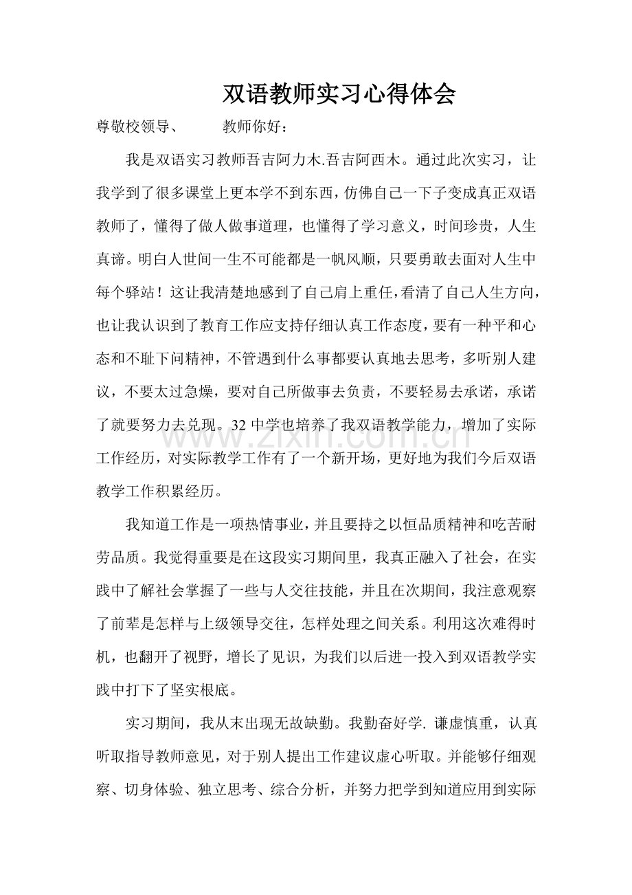 我是双语实习教师吾吉阿力木.吾吉阿西木。通过此次实习,让我学到了很多课堂上更本学不到东西,仿佛自己一下子变成真正双语教师了,懂得了做人做事道理,也懂得了学习意义,时间珍贵,人生真谛。明白人世间一生不可能都是一帆风顺,只要勇敢去面对人生中每个驿站!这让我清楚地感到了自己肩上重任,看清了自己人生方向,也让我认识到了教育工作应支持仔细认真工作态度,要有一种平和心态和不耻下问精神,不管遇到什么事都要认真地去思考,多听别人建议,不要太过急燥,要对自己所做事去负责,不要轻易去承诺,承诺了就要努力去兑现。32中学也培养了我双语教学能力,增加了实际工作经历,对实际教学工作有了一个新开场,更好地为我们今后双语教学工作积累经历。