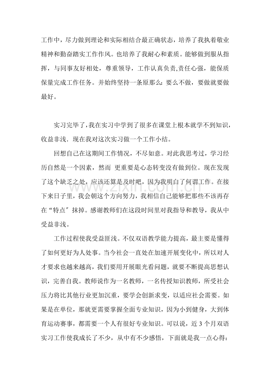 工作过程使我受益匪浅。不仅双语教学能力提高,最主要是懂得了如何更好为人处事。当今社会一直处在加速开展变化中,所以对人才要求也越来越高,我们要用开展眼光看问题,就要不断提高思想认识,完善自我。教师说作为一名教师,一名传授知识教师,所受社会压力将比其他行业更加沉重,要学会创新求变,以适应社会需要。如果是在单位,那就更需要掌握全面专业知识,因为小到健身,大到体育运动赛事,都需要一个人有很好专业知识。可以说,近3个月双语实习工作使我成长了不少,从中有不少感悟,下面就是我一点心得: