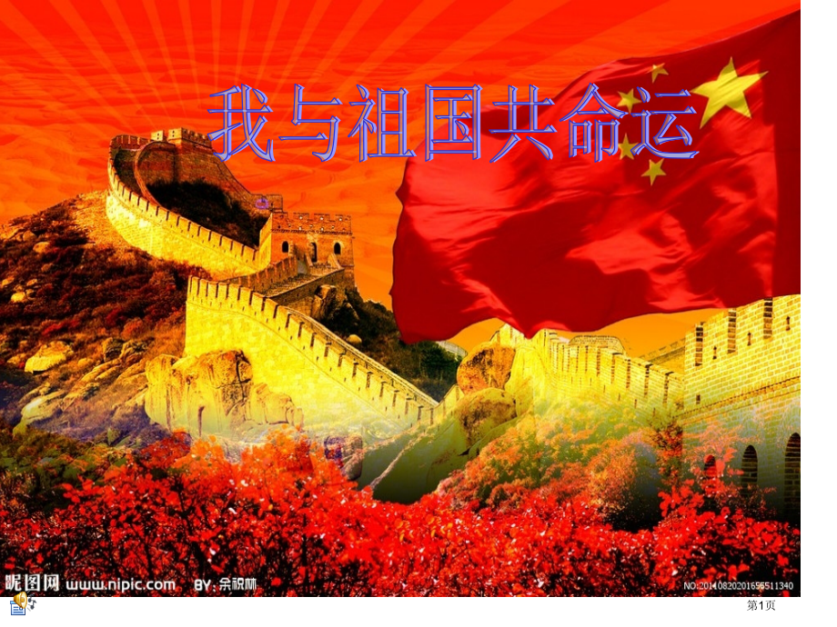 单击此处编辑母版标题样式,单击此处编辑母版文本样式,第二级,第三级,第四级,第五级,*,单击此处编辑母版标题样式,单击此处编辑母版文本样式,第二级,第三级,第四级,第五级,*,我与祖国共命运,第1页,2,我与祖国共命运,1,3,国难当头匹夫有责,国强民富,祖国发展我成长,为友好社会尽一份力,第2页,国难当头匹夫有责,1949,1950-1953,1998,1938-1949,工农皆兵拯救中华民族,中国支援朝鲜战争,悲喜交加,中华人民共和国成立,抗洪,捍卫国家领土主权完整,第3页,(1938-1949)工农皆兵拯救中华民族,在抗日战争和解放战争中,军队抵达地方是有很多地形复杂或者运输物质缺乏人手,当地群众就会自发前往支援,他们用双手,用轮车,用自家畜牲等等,是军队拥有源源不停物质提供。因为全民参加抗日和解放战争,这才致使战争胜利,。,第4页,(1950-1953)中国支援朝鲜战争,当祖国安全受到威胁时,我们就要主动去从军抗敌,因为祖国命运就是我们命运,祖国一旦被攻破,我们就有可能沦为敌军阶下囚,所以我们命运跟祖国命运连在一起。,第5页,(1998)抗洪,这是98年抗洪,当祖国需要我们时,我们义不容辞,祖国出现困难时,我们都应该出自己一份力,这是抗洪后照片,身上已经脱去一层皮,在水里生活那么长时间,我们无怨无悔,因为我们跟祖国命运共命运,只有祖国繁荣兴盛,我们老百姓才能过上衣食无忧,幸福美满生活,第6页,(2008)悲喜交加,年5月12号,就在这一天,在中国汶川发生了8级大地震,一瞬间,几千万人民生活在生死边缘,就在这时我们主动捐款,捐物资,而解放军,志愿者都纷纷赶至汶川,就连乞丐也来捐款,原来他们是向他人要钱,但在祖国危难时候,他都会挺身而出。,第7页,(2012)捍卫祖国领土完整,这就是最近钓鱼岛和黄岩岛事件,日本和菲律宾都野心勃勃,当我们祖国主权和领土受到侵犯时,这不是土地问题,这是尊严问题,一个国家能够随便被别国家侵犯,他公民将被别国家所瞧不起,面对这些问题,身为大学生我们该怎么办啊?我们应该站起来告诉他们,这些岛屿都是中国,还有我以为我们也应该努力学习,让自己国家比其它国家更强大,科技更发达,武器更先进,到时就不会有哪个国家敢小看中国,我们领土,主权都不会受到侵犯。,第8页,合作探究:,个人命运和祖国命运关系?,第9页,国强民富,祖国发展我成长,衣食住行,教育,医疗,社会保障,人均寿命,基础设施,第10页,衣食住行,改革开放前中国衣食住行,第11页,衣食住行,改革开放后中国衣食住行,第12页,教育,教育发展是衡量一个国家发展水平和发展潜力主要指标。改革开放30年,中国教育发展取得长足进步。1978年中国普通高等学校毕业生数只有16.5万,占当初中国人口总量96259万0.0171%。中国普通高等学校毕业生数到达377.5万,占当年中国人口总量131448万0.2871%,30年间增加了16.7倍。,第13页,合作探究:,祖国发展为我们提供了,哪些有利条件?,第14页,1,2,3,4,为和谐社会尽一份力,资源与环境,食品安全,社会道德,社会腐败,第15页,北京沙尘暴,上海猪江,资源与环境,第16页,社会的腐败,兰州市长被曝戴价值,20,余万名表,职务犯罪人数逐年上升,第17页,食品安全,双汇瘦肉精事件,地沟油事件,第18页,社会道德,范跑跑事件,彭宇案事件,第19页,倡议,人民群众:应少点指责,多点宽容和多点提出处理问题提议,政府:加强法制、党本身和监督机制建设,第20页,说一说:,1,、为了促进友好,你所在班级、学校、小区开展了哪些活动?,2,、你心目中友好社会是什么样子?,议一议:,创建社会主义友好社会我们能做些什么?,第21页,