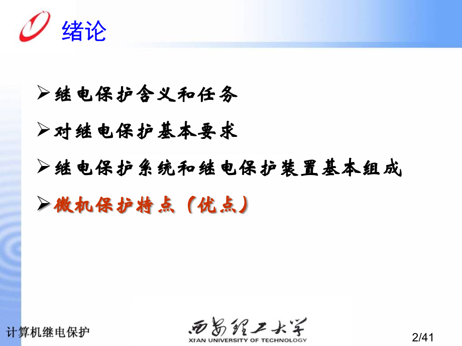 单击此处编辑母版标题样式,单击此处编辑母版文本样式,第二级,第三级,第四级,第五级,*,本资料仅供参考,不能作为科学依据。谢谢。本资料仅供参考,不能作为科学依据。本资料仅供参考,不能作为科学依据。谢谢。本资料仅供参考!,单击此处编辑母版标题样式,单击此处编辑母版文本样式,第二级,第三级,第四级,第五级,*,本资料仅供参考,不能作为科学依据。谢谢。本资料仅供参考,不能作为科学依据。本资料仅供参考,不能作为科学依据。谢谢。本资料仅供参考!,课程总目录,绪论,第一章 微机保护硬件原理,第二章 数字滤波器,第三章 微机保护算法,第四章 提升微机保护可靠性办法,第五章 微机保护软件结构,1/41,绪论,继电保护含义和任务,对继电保护基本要求,继电保护系统和继电保护装置基本组成,微机保护特点(优点),2/41,微机保护装置,硬件系统组成部分及各部分功效,电压形成回路作用、电抗/流变换器特点,采样保持电路作用,采样频率选择、模拟低通滤波器作用、采样定理内容,模拟多路开关作用,DAC及,逐次迫近式ADC工作原理(二分搜索法),VFC型数据采集系统原理、特点,VFC分辨率与采样频率关系(计算),开关量输入输出回路接线图(图1-3436),第一章 微机保护硬件原理,3/41,微机保护装置本质上就是一个,含有继电保护功效微机系统。,硬件组成:,数据采集系统,微机主系统,输入/输出系统,软件组成:,数字滤波器,继电器算法,保护动作判据,逻辑输出,绪论:,微机保护装置组成,4/41,1 硬件原理概述,Fig.,微机保护硬件组成框图,数据采集系统,微机主系统,I/O系统,5/41,数字滤波器概念、特点,时间窗、数据窗概念,线性时不变系统差分方程、系统函数、频率响应(会分析和计算),会分析简单滤波单元及其级联滤波器滤波特征,会采取零极点法设计数字滤波器,采样信号频谱与原连续信号频谱关系,非递归型、递归型滤波器概念及各自特点,第二章 数字滤波器,6/41,算法概念及评价标准,基于正弦量算法:两点乘积法、导数法、半周积分法原理,所需数据窗长度,傅里叶级数算法原理,采取付氏算法计算幅值和相位,付氏算法本身含有滤波特征,RL模型算法(解微分方程法)原理,突变量(故障分量)概念及提取公式,故障分量阻抗继电器接线方式、工作原理与动作方程、动作特征分析,第三章 微机保护算法,7/41,干扰概念、形式及耦合路径,干扰对微机保护装置影响,微机保护装置抗干扰办法(硬件、软件),程序出格概念、其自恢复电路,自动检测、多重化和容错技术,第四章 提升微机保护可靠性办法,8/41,中止功效作用,程序流程基本结构,电流保护流程图,第五章 提升微机保护可靠性办法,9/41,习题,1.图为逐次迫近法模数转换器原理图。已知图中数模转换器量程为08V,模拟量输入电压 。试说明对该模拟量输入转换过程。,10/41,逐次迫近法模数转换器迫近步骤通常采取二分搜索法。对于n位转换器,二分搜索法只要比较n次就可转换完成。,第一步,微型机向并行口PB02输出二进制数“100”,经过数模转换器DAC转化得到模拟量,经过比较器比较,和,比较器输出为“1”,即说明“100”偏小。,11/41,第二步,微型机向PB02输出“110”,经过DAC转化得到,经过比较器比较知,比较器输出为“0”,“110”偏大。,第三步,微型机向PB02输出“101”,经过DAC转化得到,经过比较器比较知,比较器输出为“1”,转换结果为“101”。,12/41,第四步,微型机向PB02输出“101”,经过DAC转化得到,经过比较器比较知,比较器输出为“1”,转换结果为“101”。,3位ADC 3次比较,13/41,2.设在VFC数据采集系统中,最高输出频率,若取积分间隔,试问相当于几位逐次迫近式模数转换器?,分析,:分辨率普通用A/D转换器输出数字量位数来衡量。VFC等效位数取决于两个原因:,VFC最高频率,采样间隔,与积分间隔,大小。,14/41,VFC最大输出数字量,与,之间关系为,VFC分辨率,所以,相当于11.7位逐次迫近式A/D转换器。,15/41,(一)差分滤波单元(减法滤波器),简单滤波单元滤波特征分析:,16/41,幅频特征,相频特征,f2,信号频率,17/41,每基频周期采样次数为,N,讨论,m、k、f,s,之间关系,正整数或,0,基频,谐波次数,18/41,可滤除m次谐波,19/41,20/41,当极点,d,i,处于单位圆上时,在,d,i,所在点频率响应将出现无穷大,,相当于在该频率处出现无耗谐振。,当零点处于单位圆时,频响为0,。,零、极点法数字滤波器设计:,21/41,零点设计法:,希望滤除,f,k,频率分量,则使该频率对应频率响应为0,22/41,离散值计算公式中,滤波系数必须为实数,。,(1)零点在实轴上。,(2)零点应为一对共轭。,23/41,0,1,3,0,1,4,2,5,希望滤除频率分量为不一样,f,k,时滤波器传递函数,24/41,例:设 ,用零点设计法设计出能同时滤除3次和5次谐波分量数字滤波器传递函数。,解:,25/41,26/41,极点设计法:,希望突出,f,k,频率分量,27/41,系数为实数,所以极点应为一对共轭。,p,值选择:,p,值越靠近于1,滤波效果越好,但到达稳定所需时间就长。,p,值越靠近于0,滤波效果越差,但到达稳定所需时间就短。,28/41,例:突出基波滤波器,解:,29/41,例,如图所表示为一周期电压信号 ,时刻对应坐标原点。已知每个周期采样12个点。,(1),时刻开始采样,利用傅里叶级数算法求,、,、,及电压信号有效值;,时刻开始采样,利用傅氏级数算法求,、,、,及电压信号有效值。,(2)从,30/41,在用微型机处理时,基波分量正、余弦项振幅,、,可用下式求得:,31/41,将上述采样值代入,得,32/41,33/41,(2)从图
