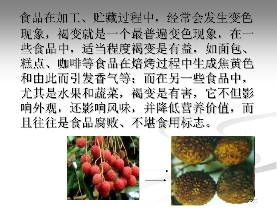 ,*,单击此处编辑母版标题样式,单击此处编辑母版文本样式,第二级,第三级,第四级,第五级,食品化学,褐变,第1页,食品在加工、贮藏过程中,经常会发生变色现象,褐变就是一个最普遍变色现象,在一些食品中,适当程度褐变是有益,如面包、糕点、咖啡等食品在焙烤过程中生成焦黄色和由此而引发香气等;而在另一些食品中,尤其是水果和蔬菜,褐变是有害,它不但影响外观,还影响风味,并降低营养价值,而且往往是食品腐败、不堪食用标志。,第2页,褐变按其发生机制可分为酶促褐变和非酶褐变两大类。,第3页,酶促褐变,酶引发褐变多发生在较浅色水果和蔬菜中,比如苹果、香蕉和土豆等,当它们组织被碰伤、切开、削皮,就很易发生褐变,这是因为它们组织暴露在空气中,在多酚酶催化下,多酚类物质被氧化为邻醌,邻醌再深入氧化聚合而形成褐色色素(或黑色素、类黑精)。,第4页,酶促褐变物质条件,酚类物质,:植物体内酚类物质种类多,分布广,含量丰富。该物质主要是由碳水化合物代谢衍生出来产物。,与褐变相关酶类,:与酶促褐变亲密相关酶类主要是多酚氧化酶(PPO)它是一个含铜离子膜蛋白酶,大多存在于细胞中,有也存在于细胞膜和细胞壁上。PPO所能引发反应常会使果肉褐变,产生异味,并造成营养成份损失等。,第5页,氧存在,:氧气是生物生命活动主要参加物质,也是生命活动不可缺乏。在正常发育植物组织中,酚类物质、氧气、PPO 同时存在并不发生褐变,这可能与细胞内酚类物质和PPO 区域性相关,也可能因为在正常组织细胞内因为酚类物质分布在细胞液胞内,而PPO 则分布在各种质体或细胞质内,这种区域性分布使酚类物质与PPO 不能接触。而当细胞膜结构发生改变和破坏时,则为酶创造了与酚类物质 接触条件,在氧存在情况下使酚类物质氧化成醌,进行一系列脱水,聚合反应,最终形成黑褐色物质,从而引发褐变。,第6页,第7页,由此可知:,食品发生酶促褐变,必须具备三个条件:即有,多酚类物质,、,多酚氧化酶,和,O,2,。有些瓜果如柠檬、桔子及西瓜等因为不含多酚氧化酶,故不会发生酶促褐变。,第8页,怎样才能预防食物发生酶促褐变呢?,第9页,在实际工作中,可采取,热处理法,、,酸处理法,和,与空气隔绝,等方法预防食物褐变。,第10页,热处理法,适当加热可使酚酶及其它全部酶类失去活性,故果汁生产中常采取原料烫漂和高温短时间快速灭酶。起源不一样多酚氧化酶对热敏感性不一样,然而7090加热约7s,可使大部分多酚氧化酶失活。而使多酚氧化酶完全失活,需要在80时1020min或沸水中2min。但加热处理也有缺点,因为水果和蔬菜经加热后,会影响原有风味,所以必须严格控制加热灭菌温度和时间,尽可能到达灭酶目标而不影响产品风味。采取微波加热法,能到达很好效果。,第11页,调整pH值,酚酶引发氧化最适宜pH为,所以降低pH值可抑制酶催化作用。pH值在3以下,酚酶几乎完全丧失。苹果和杏pH值如调到2.5时,酚酶活性完全消失。用降低pH值方法来预防果蔬饮料发生褐变最惯用方法。普通多采取柠檬酸,苹果酸,抗坏血酸及其它有机酸混合溶液。实践证实:0.5柠檬酸与0.3抗坏血酸合成效果很好。,第12页,驱氧法,组织中含较多氧果蔬,可浸入水中或糖浆中,然后进行真空脱气处理,使水或糖浆渗透水果组织占据原来氧所占空间。因为与氧隔离,褐变就能被抑制。所以果蔬饮料普通进行真空脱气处理。,第13页,非酶褐变,在食品贮藏及加工中,常发生与酶无关褐变作用,这种褐变常伴随热加工及较长久贮存而发生,它主要包含迈拉德反应焦糖化反应以及抗坏血酸作用。,第14页,迈拉德反应,法国化学家迈拉德于19发觉,当甘氨酸与葡萄糖溶液共热时,会形成褐色色素(也叫类黑精),以后这种反应就被称为迈拉德反应,它包含胺基化合物和羰基化合物之间类似反应在内。因为食品中都含有这二类物质(蛋白质及碳水化合物),所以食品都有可能发生此反应。,第15页,当不希望食品出现迈拉德褐变时,只要使水活性降低至0.2以下就能抑制这种反应发生,增大液体食品稀释度或者降低pH和温度,也可到达一样效果。另外,除去食品中能参加褐变反应底物也能使褐变程度减弱,这种底物通常是糖类。,第16页,控制食品加工贮藏中迈拉德褐变主要意义,褐变产生深颜色及强香气和风味,对许多食品在品质上,尤其是感官上可能是需要或是不需要。比如,面包焙烤中需要加深其颜色和香味,就需要褐变。反之,果汁热加工时为保持其新鲜水果风味,需阻止褐变;,第17页,为了预防营养成份损失,尤其是必需氨基酸如赖氨酸损失,需要防止发生褐变反应。这种营养损失对于赖氨酸缺乏食品(比如谷物)是很主要。大豆粉或大豆离析物与D-葡萄糖一起加热时,大豆蛋白质中赖氨酸将会大量损失,一样对于谷物焙烤食品、面包和豆类焙烤制品也会引发损失。,第18页,迈拉德反应不但影响产品色泽,而且也影响食品香味,这是因为在反应中生成了众多香成份,霍奇(Hodge)等人最先讨论了羰氨反应,并总结于下页图,第19页,第20页,从图上可看出,迈拉德反应体系产物复杂多样,是经过食物组分即前驱体(Precursor)在加热过程中发生反应形成。常见前驱体有还原糖、氨基酸、游离脂肪酸、二肽、酚类化合物、类黄酮类、类胡萝卜素、维生素、脂肪酸甘油酯等。,第21页,经过迈拉德反应形成反应香料香味往往不是一个或几个物质决定,而往往是很多成份