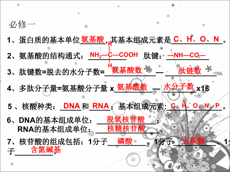 单击此处编辑母版标题样式,单击此处编辑母版文本样式,第二级,第三级,第四级,第五级,*,高中生物,必修一,精要知识点,1,、蛋白质的基本单位,_,其基本组成元素是,_,。,2,、氨基酸的结构通式:,_,肽键:,_,3,、肽键数,=,脱去的水分子数,=_ _,4,、多肽分子量,=,氨基酸分子量,x_ _x18,5,、核酸种类:,_,和,_,;基本组成元素,:_,。,6,、,DNA,的基本组成单位:,_,;,RNA,的基本组成单位:,_,。,7,、核苷酸的组成包括:,1,分子,_,、,1,分子,_,、,1,分子,_,。,氨基酸,C,、,H,、,O,、,N,NHCO,氨基酸数,肽链数,氨基酸数,水分子数,DNA,RNA,C,、,H,、,O,、,N,、,P,脱氧核苷酸,核糖核苷酸,磷酸,五碳糖,含氮碱基,NH,2,CCOOH,R,H,必修一,8,、,DNA,主要存在于,_,中,含有的碱基为,_,;,RNA,主要存在于,_,中,含有的碱基为,_,;,9,、细胞的主要能源物质是,_,,直接能源物质是,_,。,10,、葡萄糖、果糖、核糖属于,_,糖;,蔗糖、麦芽糖、乳糖属于,_,糖;,淀粉、纤维素、糖原属于,_,糖。,11,、脂质包括:,_,、,_,和,_,。,12,、大量元素:,_,(,9,种),微量元素:,_,(,6,种),基本元素:,_,(,4,种),最基本元素:,_,(,1,种),主要元素:,_,(,6,种),A,、,G,、,C,、,T,细胞核,细胞质,糖类,ATP,A,、,G,、,C,、,U,单,二,多,脂肪,磷脂,固醇,C,、,H,、,O,、,N,、,P,、,S,、,K,、,Ca,、,Mg,C,、,H,、,O,、,N,Fe,、,Mn,、,B,、,Zn,、,Cu,、,Mo,C,C,、,H,、,O,、,N,、,P,、,S,13,、水在细胞中存在形式:,_,、,_,。,14,、细胞中含有最多的化合物:,_,。,15,、血红蛋白中的无机盐是:,_,,叶绿素中的无机盐是:,_,16,、被多数学者接受的细胞膜模型叫,_,模型。,17,、细胞膜的成分:,_,、,_,和少量,_,。,细胞膜的基本骨架是,_,。,18,、细胞膜的结构特点是:,_,;,功能特点是:,_,。,自由水,结合水,水,Fe,2+,Mg,2+,流动镶嵌,脂质,蛋白质,糖类,磷脂双分子层,具有流动性,具有选择透过性,19,、具有双层膜的细胞器:,_,、,_,;,不具膜结构的细胞器:,_,、,_,;,有“动力车间”之称的细胞器是,_,;,有“养料制造车间”和“能量转换站”之称的是,_,;,有“生产蛋白质的机器”之称的是,_,;,有“消化车间”之称的是,_,;,存在于动物和某些低等植物体内、与动物细胞有丝分裂有关的细胞器是,_,。,与植物细胞细胞壁形成有关、与动物细胞分泌蛋白质有关的细胞器是,_,。,20,、细胞核的结构包括:,_,、,_,和,_,。,细胞核的功能:是,_,的场所,,是,_,的控制中心。,21,、原核细胞和真核细胞最主要的区别:,_,_,。,线粒体,叶绿体,中心体,核糖体,叶绿体,线粒体,核糖体,溶酶体,中心体,高尔基体,核膜,核仁,染色质,遗传物质贮存和复制,细胞代谢和遗传,有无以核膜为界限的,细胞核,22,、物质从高浓度到低浓度的跨膜运输方式是:,_,和,_,;,需要载体的运输方式是:,_,和,_,;,需要消耗能量的运输方式是:,_,;,23,、酶的化学本质:多数是,_,,少数是,_,。,24,、酶的特性:,_,、,_,、,_,。,25,、,ATP,的名称是,_,,结构式是:,_,。,ATP,是各项生命活动的,_,能源,被称为能量“,_”,。,26,、,ATP,与,ADP,相互转化的反应式:,_,。,27,、动物细胞合成,ATP,,所需能量来自于,_,作用;,植物细胞合成,ATP,,所需能量来自于,_,作用和,_,作用。,自由扩散,协助扩散,主动运输,协助扩散,主动运输,蛋白质,RNA,高效性,专一性,作用条件温和,三磷酸腺苷,APPP,直接,通货,ATP,ADP+Pi+,能量,酶,呼吸,呼吸,光合,28,、叶片中的色素包括两类:,_,和,_,。前者,又包括,_,和,_,,后者包括,_,和,_,。,以上四种色素分布在叶绿体的,_,上。,29,、叶绿素主要吸收,_,光和,_,光,类胡萝卜素主要吸收,_,光。因此,_,光和,_,光的光合效率较高。,30,、光合作用的反应式:,_,31,、光合作用释放出的氧气,其氧原子来自于,_,。,32,、在绿叶色素的提取和分离实验中,无水乙醇作用是,_,,二氧化硅作用是,_,,碳酸钙作用是,_,。,33,、层析液不能没及滤液细线,是为了防止,_,_,叶绿素,类胡萝卜素,叶绿素,a,叶绿素,b,胡萝卜素,叶黄素,类囊体薄膜,蓝紫,红,蓝紫,蓝紫,红,见必修一,P 103,水,溶解色素,使研磨充分,防止色素受到破坏,滤液细线上的色素,溶解到层析液中,导致实验失败。,34,、色素分离后的滤纸条上,色素带从上到下的顺序是:,_,、,_,、,_,、,_,。,35,、光合作用包括两个阶段:,_,和,_,。前者的场所是,_,,后者的场所是,_,。,36,、光反应为暗反应提供,_,和,_,。,37,、有氧呼吸反应式:,_,38,、无氧呼吸的两个反应式:,_,_,39,、有丝分裂的主要特征:,_,和,_,的出现,然后,_,平均分配到两个子细胞中。,胡萝卜素,叶黄素,叶绿素,a,叶绿素,b,光反应,暗反应,叶绿体基质,类囊体薄膜,ATP,H,见必修一,P 93,见必修一,P 95,见必修一,P 95,染色体,纺锤体,染色体,40,、细胞分化的原因:基因的,_,。,41,、检测还原糖用,_,试剂,其由,_,和,_,组成,与还原糖发生反应生成,_,色沉淀。使用时注意,_,。,42,、鉴定生物组织中的脂肪可用,_,染液和,_,染液。前者将脂肪染成,_,色,后者染成,_,色。,43,、鉴定生物组织中的蛋白质可用,_,试剂。使用时先加,_,,后加,23,滴,_,。反应生成,_,色络合物。,44,、给染色体染色常用的染色剂是,_,或,_,。,45,、“观察,DNA,和,RNA,在细胞中的分布”中,用,_,和,_,两种染色剂染色,,DNA,被染成,_,色,,RNA,被染成,_,色。,斐林,选择性表达,0.1g/ml,的,NaOH,溶液,0.05g/ml,的,CuSO,4,溶液,砖红,现配现用,苏丹,苏丹,橘黄,红,双缩脲,NaOH,溶液,CuSO,4,溶液,紫,龙胆紫,醋酸洋红溶液,甲基绿,吡罗红,绿,红,46,、原生质层包括:,_,膜、,_,膜以及这两层膜之间的,_,。,47,、,_,染液是专一性染线粒体的活细胞染料,可以使活细胞中线粒体呈