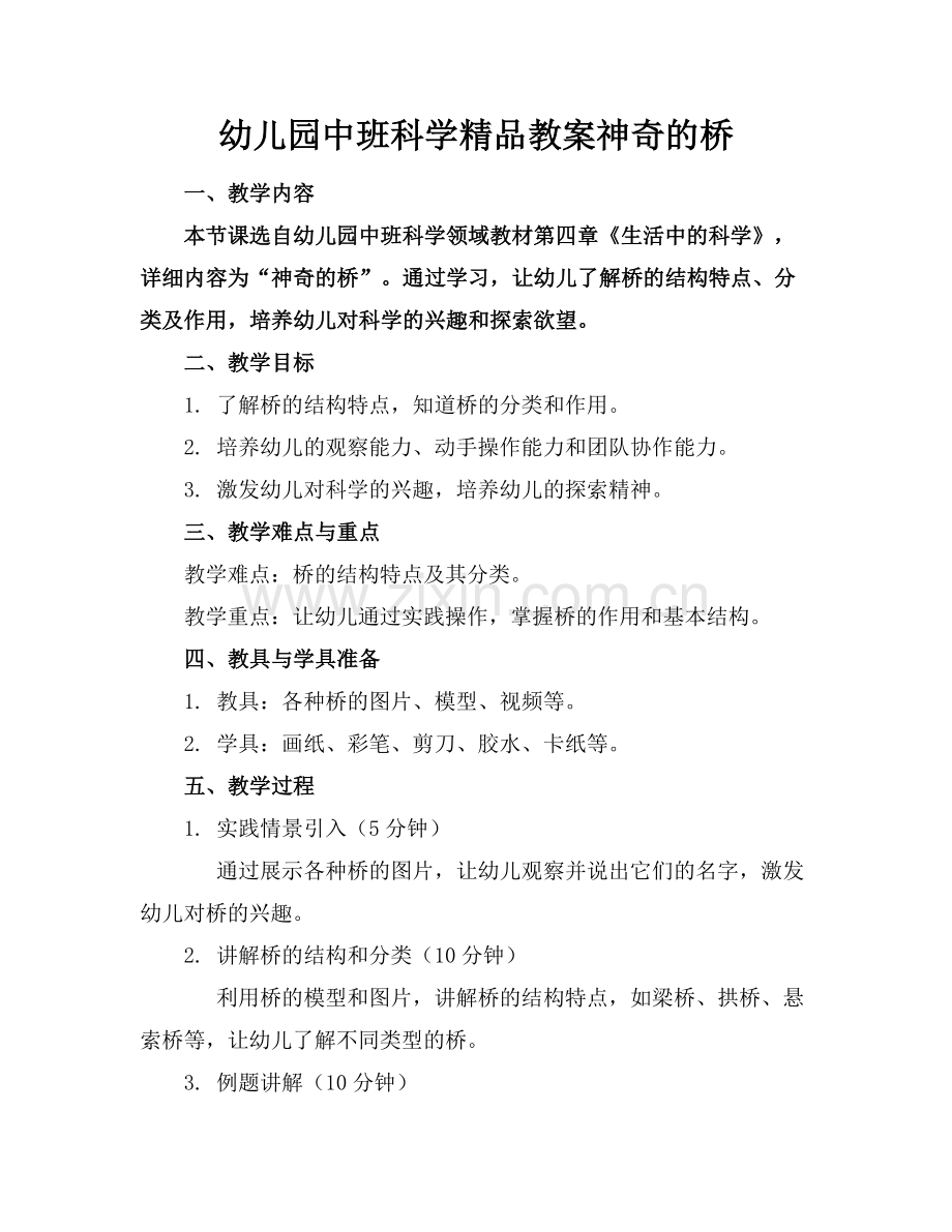 本节课选自幼儿园中班科学领域教材第四章《生活中的科学》,详细内容为“神奇的桥”。通过学习,让幼儿了解桥的结构特点、分类及作用,培养幼儿对科学的兴趣和探索欲望。