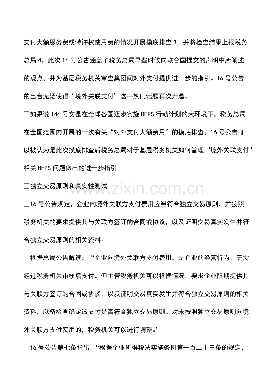 国家税务总局公告国家税务总局公告 20152015 年第年第 1616 号解读号解读2015 年 3 月 18 日,国家税务总局(以下简称“税务总局”)公布了关于企业向境外关联方支付费用有关企业所得税问题的公告(国家税务总局公告 2015 年第 16 号,以下简称“16 号公告”)及其解读(以下简称:总局公告解读)1,进一步明确了企业向境外关联方支付费用相关的转让定价问题。16 号公告所涵盖的内容包括所有向境外关联方支付的费用,因此其范围比之前的 146 号文所规定的服务费和特许权使用费更广。针对企业向境外关联方支付费用,16 号公告在继续强调相关交易应当符合独立交易原则的同时,又规定了四类费用“在计算企业应纳税所得额时不得扣除”。我们认为,16 号公告是税务总局的又一项落实税基侵蚀和利润转移(BEPS)行动计划的重要举措。详细内容16 号公告发布背景我们曾于去年报道了税务总局在 2014 年 3 月就集团内劳务和管理费问题向联合国提交了声明 2,重申了对于关联劳务的服务费收支必须符合独立交易原则,并明确了企业之间支付的管理费一般与股东活动有关,因此在计算所得税时不得扣除。随后,税务总局发布了关于对外支付大额费用反避税调查的通知(税总办发2014146 号,“146 号文”),要求各地税务机关就所属企业对境外关联方支付大额服务费或特许权使用费的情况开展摸底排查 3,并将检查结果上报税务总局 4。此次 16 号公告涵盖了税务总局早些时候向联合国提交的声明中所阐述的观点,并为基层税务机关审查集团间对外支付提供进一步的指引。16 号公告的出台无疑使得“境外关联支付”这一热门话题再次升温。如果说 146 号文是在全球各国逐步实施 BEPS 行动计划的大环境下,税务总局在全国范围内开展的一次有关“对外支付大额费用”的摸底排查,16 号公告可以被认为是此次摸底排查后税务总局对于基层税务机关如何管理“境外关联支付”相关 BEPS 问题做出的进一步指引。独立交易原则和真实性测试16 号公告规定,企业向境外关联方支付费用应当符合独立交易原则,并按照税务机关的要求提供其与关联方签订的合同或协议,以及证明交易真实发生并符合独立交易原则的相关资料。根据总局公告解读:“企业向境外关联方支付费用,是企业的经营行为,无需经过税务机关审核后支付。但主管税务机关可以根据情况,要求企业限期提供其与关联方签订的合同或协议,以及证明交易真实发生并符合独立交易原则的相关资料,以备检查确定该支付是否符合独立交易原则。对未按照独立交易原则向境外关联方支付费用的,税务机关可以进行调整。”16 号公告第七条指出,“根据企业所得税法实施条例第一百二十三条的规定,企业向境外关联方支付费用不符合独立交易原则的,税务机关可以在该业务发生的纳税年度起 10 年内,实施特别纳税调整。”四类费用“不得扣除”境外关联方不适格不得扣除16 号公告第三条规定:“企业向未履行功能、承担风险,无实质性经营活动的境外关联方支付的费用,在计算企业应纳税所得额时不得扣除”。然而,对于税务机关将会通过何种方式认定境外关联方有无履行功能、承担风险,或有无实质性经营活动,16 号公告本身并没有给出清晰的操作性指引。例如,针对仅承担集团内部企业之间的结算功能,并不实际提供其他集团内部劳务的境外关联方,税务机关是否会对此类安排进行整体评估,分析相关交易的合理性,还是直接认定向仅承担结算功能但不实际提供劳务的境外关联方支付的费用不得在税前扣除,目前尚不清楚。劳务费用不适格不得扣除税务总局在 16 号公告及其解读中指出,企业因接受境外关联方提供劳务而支付费用,该劳务应当能够使企业获得直接或者间接经济利益。企业接受受益性劳务,可以按照独立交易原则支付费用;接受非受益性劳务而支付的费用,在计算企业应纳税所得额时不得扣除。小编寄语:会计学是一个细节致命的学科,以前总是觉得只要大概知道意思就可以了,但这样是很难达到学习要求的。因为它是一门技术很强的课程,主要阐述会计核算的基本业务方法。诚然,困难不能否认,但只要有了正确的学习方法和积极的学习态度,最后加上勤奋,那样必然会赢来成功的曙光。天道酬勤嘛!16 号公告第四条规定,企业因接受下列劳务而向境外关联方支付的费用,在计算企业应纳税所得额时不得扣除:(一)与企业承担功能风险或者经营无关的劳务活动;之前的 146 号文对这类存在避税嫌疑的服务费支付有类似的规定 5;税务总局在此前递交联合国的声明中也曾对服务费的“必要性测试”进行了说明,比如,对于位于中国的承担简单功能的生产企业,可能并不需要境外母公司为该子公司提供的高端咨询及法律服务。(二)关联方为保障企业直接或者间接投资方的投资利益,对企业实施的控制、管理和监督等劳务活动;我们认为第二种情况主要针对股东活动,税务总局在此前递交联合国的声明 6和 146 号文 7 中均有说明。(三)关联方提供的,企业已经向第三方购买或者已经自行实施的劳务活动;第三种情况需要对服务费进行“重复性测试”,也是之前的 146 号文所关注的重点。经合组织跨国企业与税务机关转让定价指南(以下简称经合组织转让定价指南)也指出重复活动不应认定为集团内劳务,但经合组织转让定价指南通过举例说明