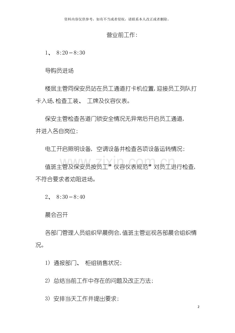 2、 经理、 主管进入卖场指导工作。 各楼层主管深入专柜检查和指导工作, 经理进入卖场定点巡查各楼层工作状况。